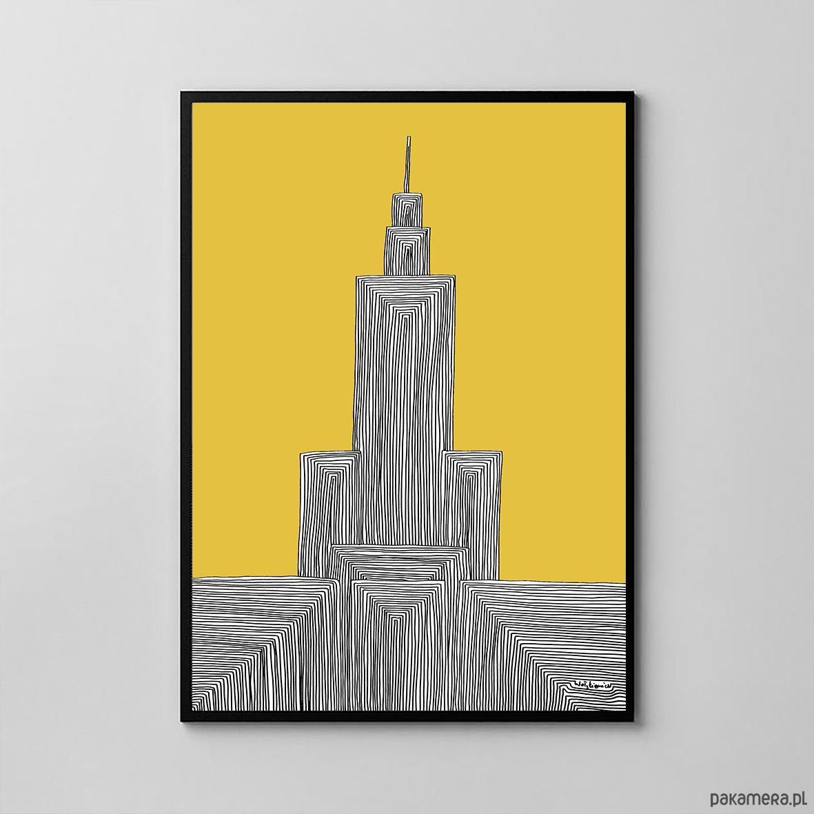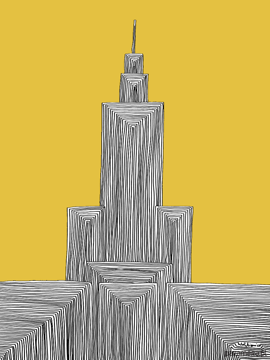 Pałac Kultury z musztardowym niebem - reprodukcja abstrakcji stworzonej markerem na papierze.