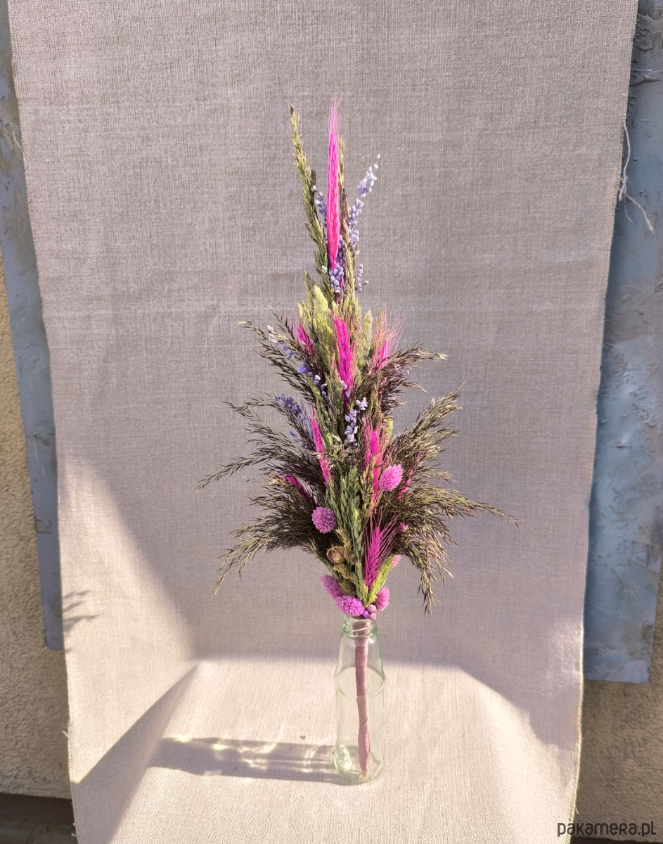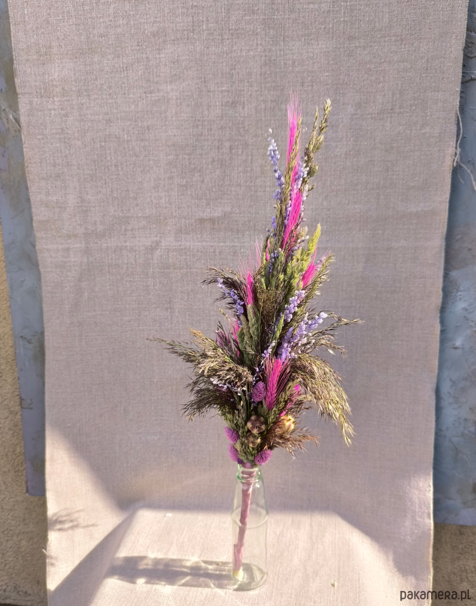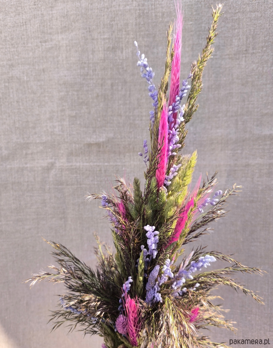 Palma wielkanocna inspirowana egzotyczną łąką- pełna pięknych suszonych zbóż w kolorze intensywnego różu, efektownej i lekkiej błękitnej trawy ozdobnej drżączki, naturalnych dzikich trzcin, naturalnych traw polnych i pięknej dekoracyjnej jasnofioletowej trawy kanar.