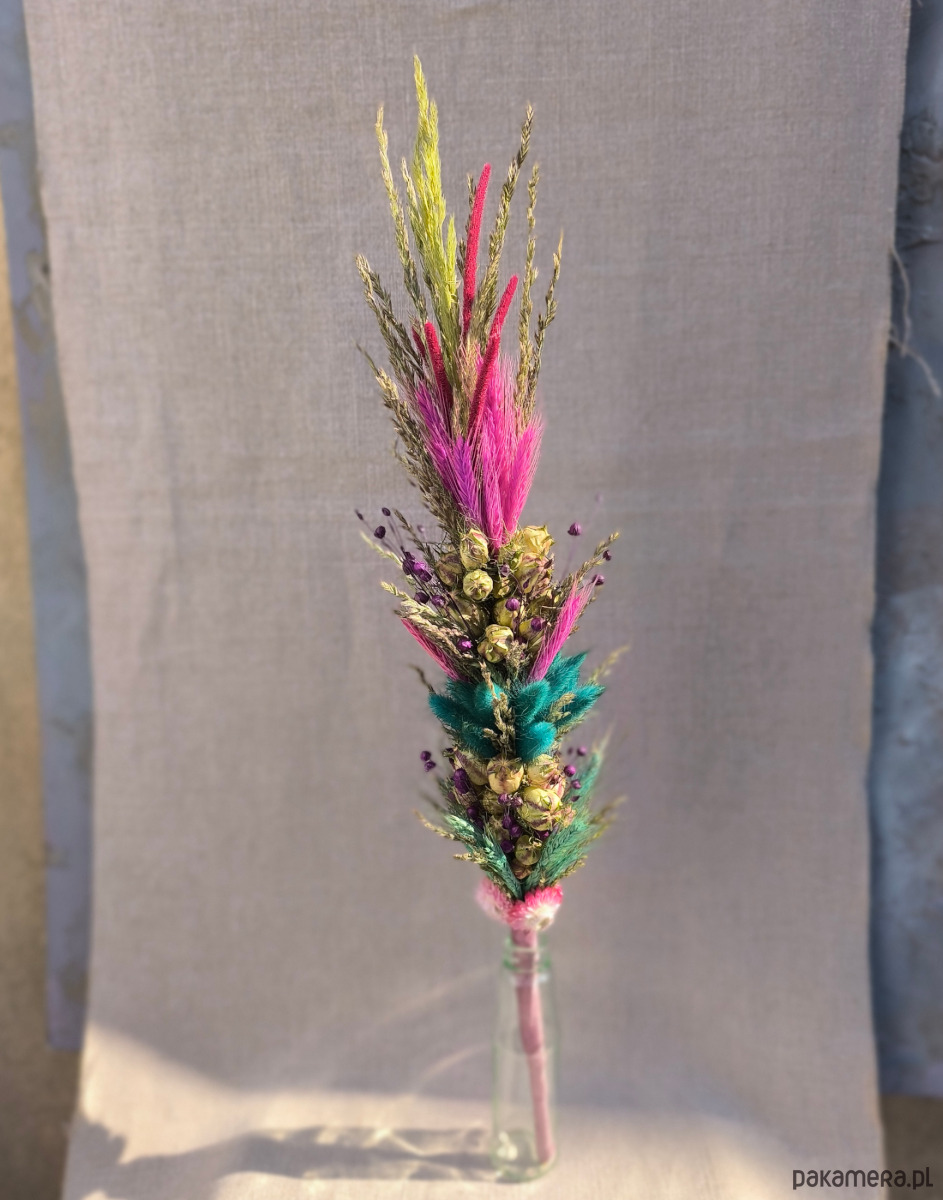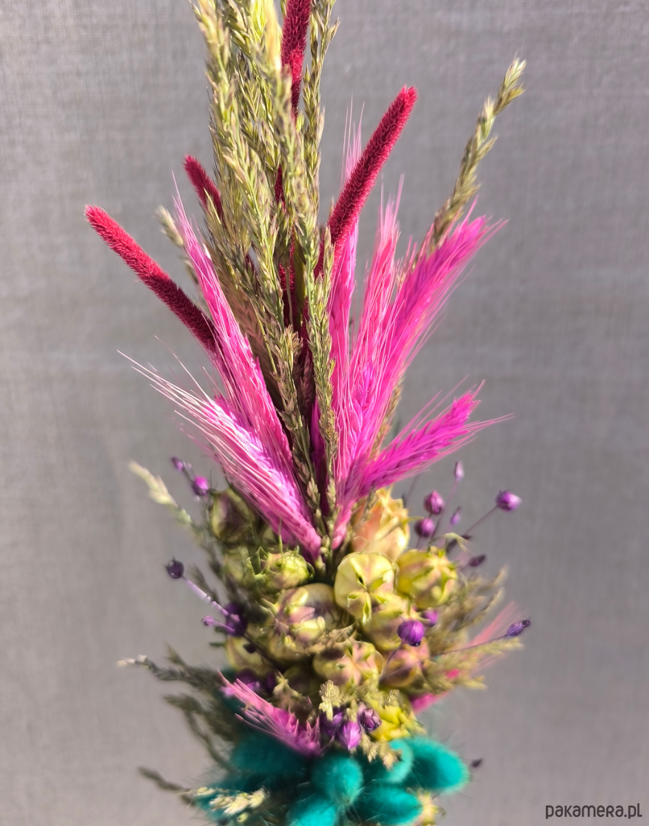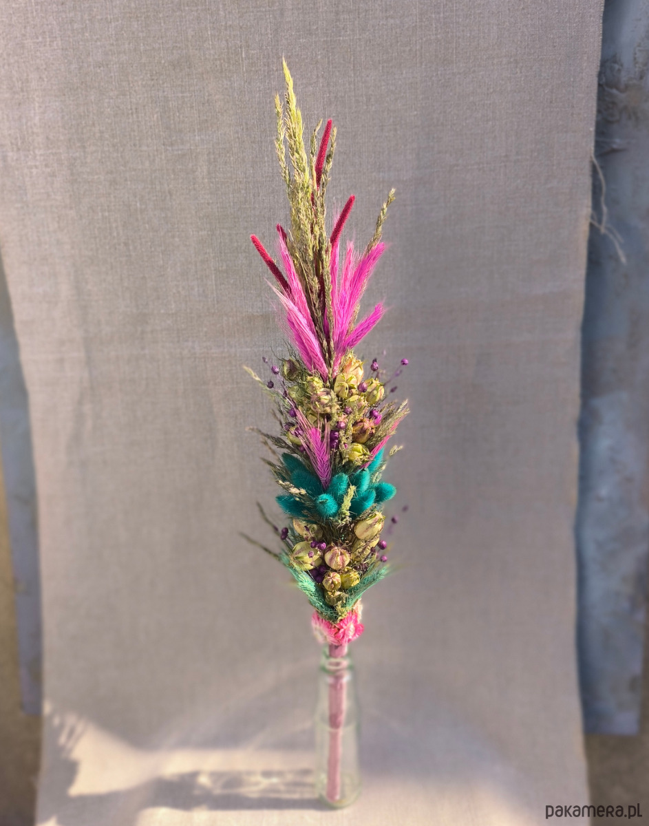 Zawiera piękne naturalne dekoracyjne trawy i kwiaty- turkusowy dmuszek, len barwiony na kosmiczny fiolet, a do tego fantazyjne różowe i turkusowe zboże, intrygującą czarnuszkę i naturalne trawy o różnych odcieniach zieleni.