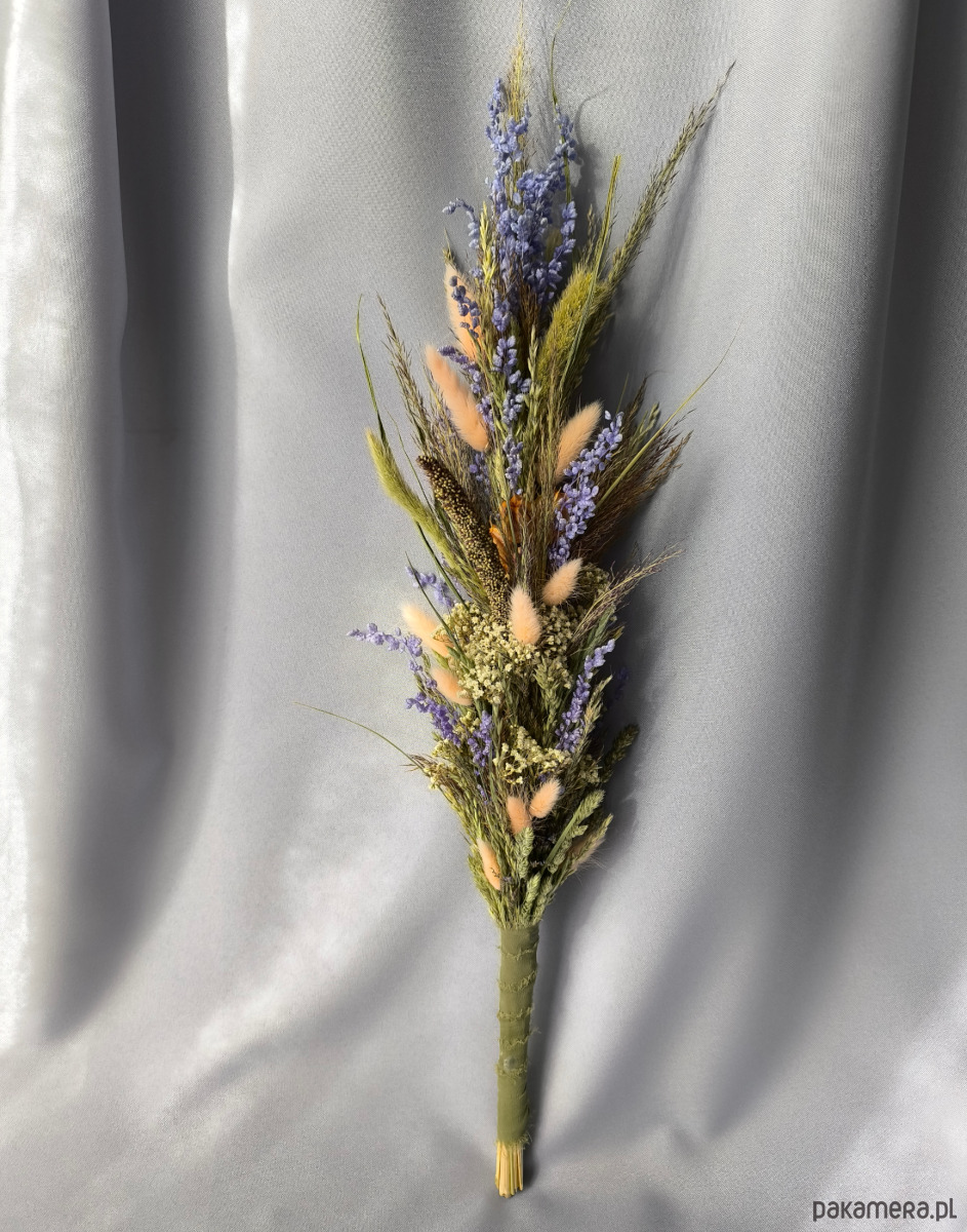 Została wykonana ze starannie dobranych gatunków roślin. W kompozycji znajduje się m.in. piękna, drobna dekoracyjna trawa drżączka, brzoskwiniowy dmuszek, stabilizowana gipsówka, polne trawy, czarnuszka.