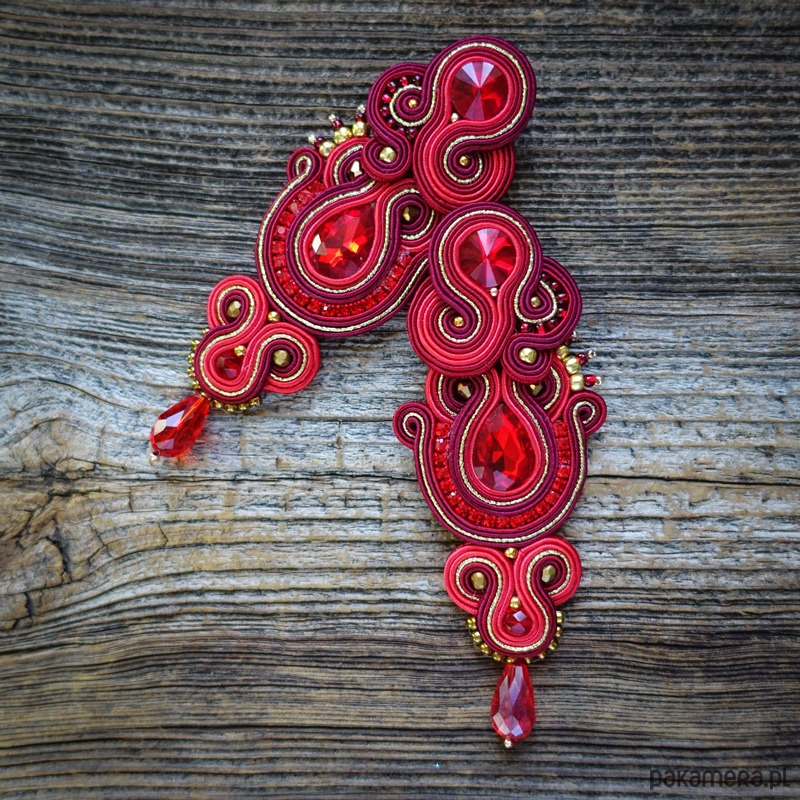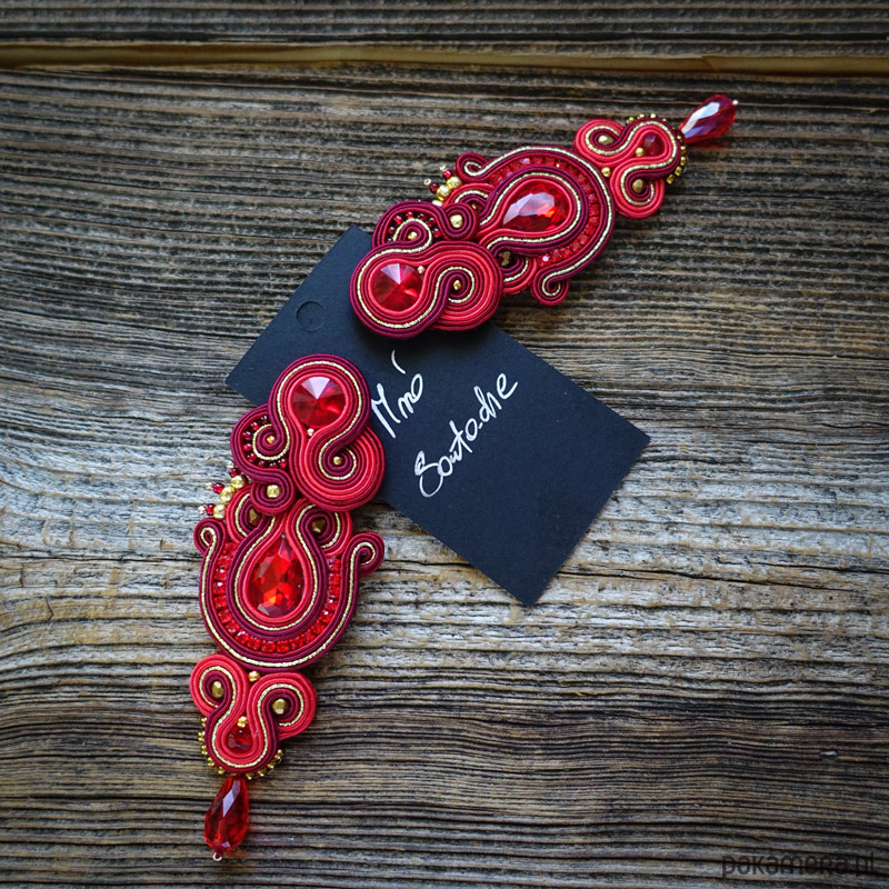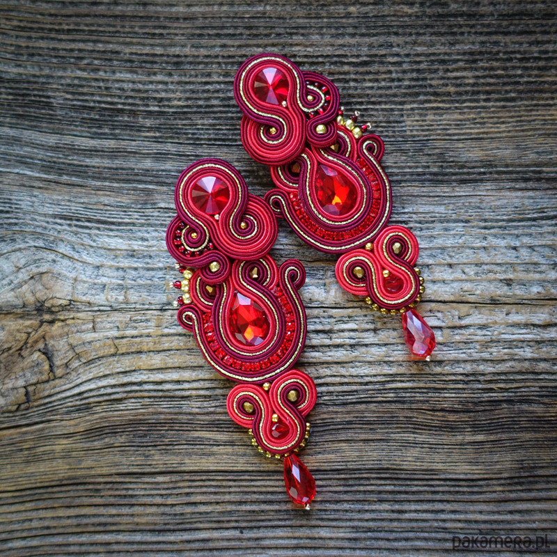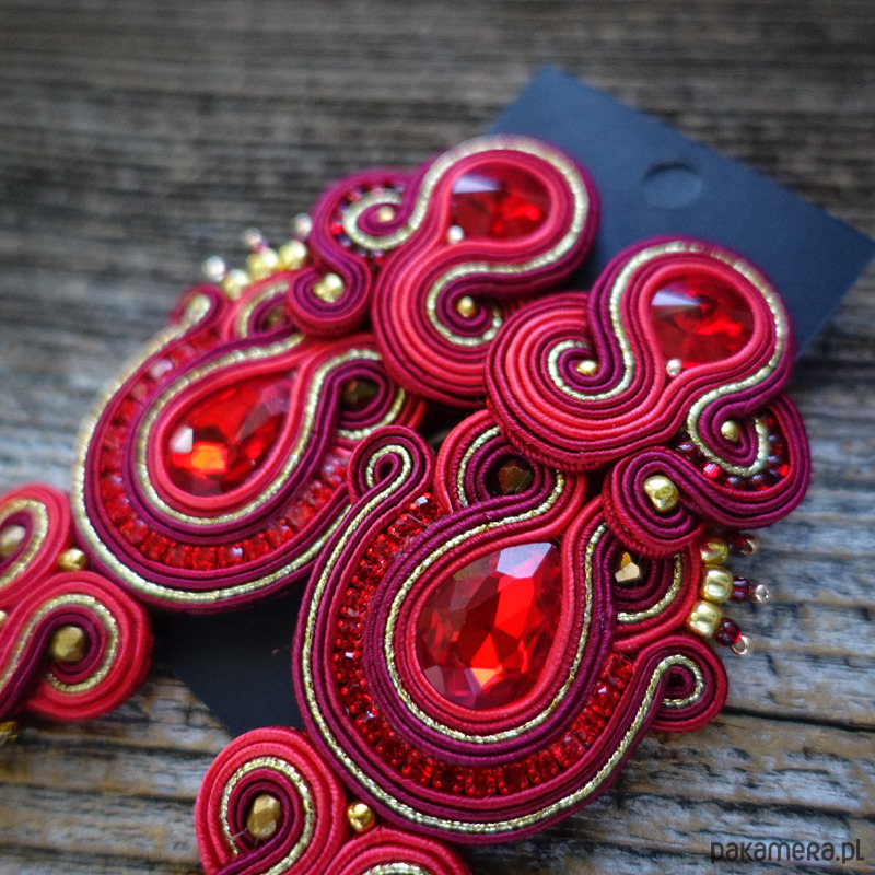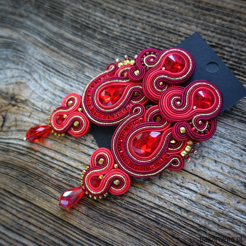 Kolczyki wykonane w technice haftu Soutache w pięknych kolorach czerwieni borda i złota.