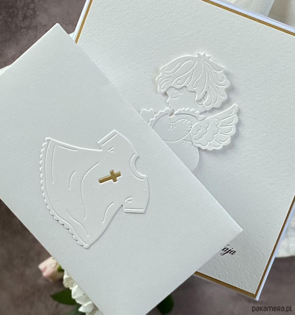 Elegancka, ręcznie robiona, personalizowana pamiątka chrztu, kartka w pudełku z ozdobną kopertą.