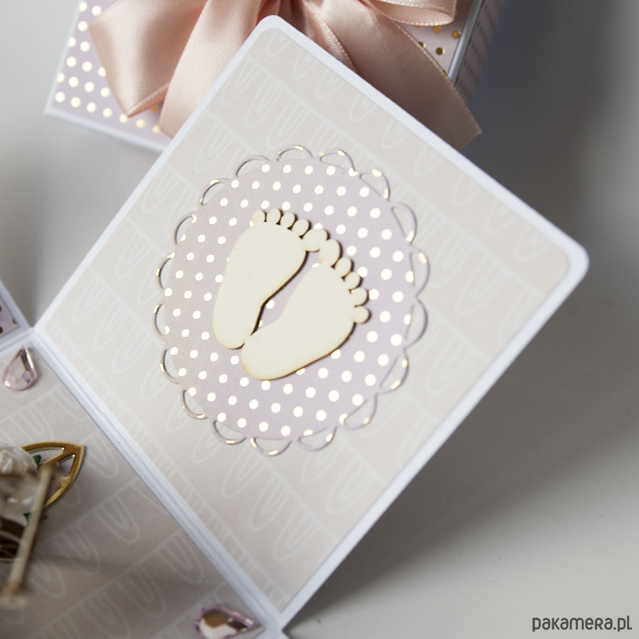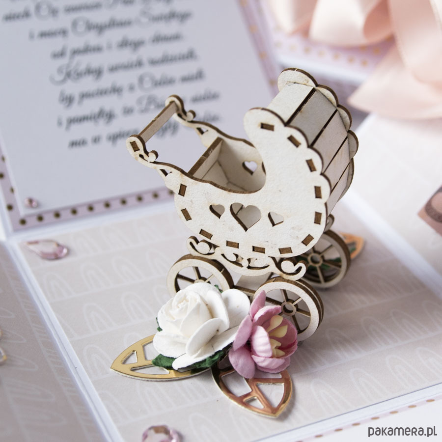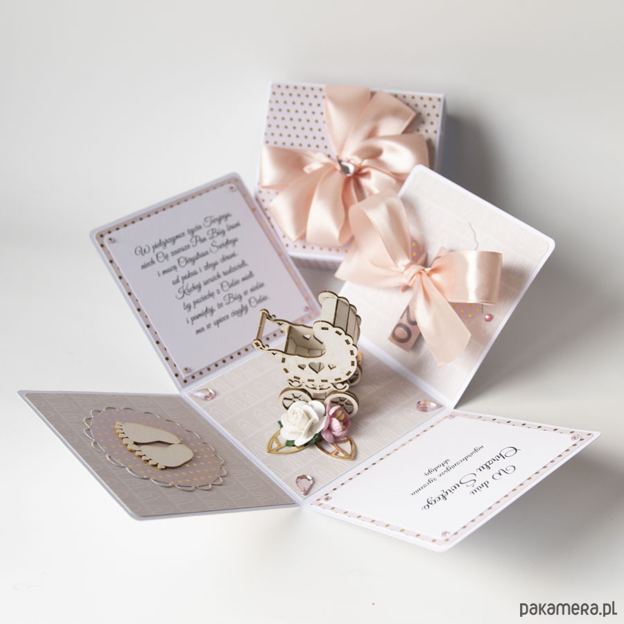 Złożone pudełeczko ma wymiary 10x10x10cm, po rozłożeniu aż 30 cm szerokości. Na ściankach znajduje się miejsce na pieniądze (zwija się je w rulonik i przewiązuje kokardą), motyw dziecięcych stópek, życzenia oraz miejsce na podpis osoby wręczającej prezent. Na środku miniaturowy wózeczek i papierowe kwiaty.