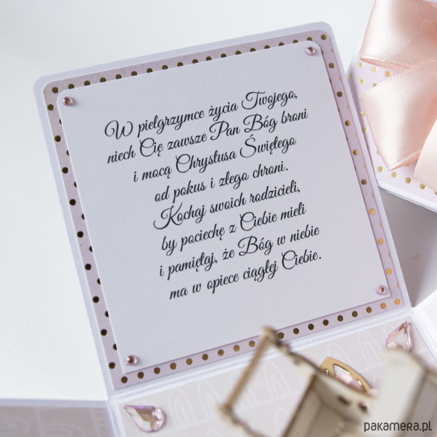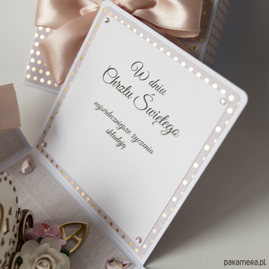 Różowe "eksplodujące" pudełeczko z rozkładami ściankami, zawierające życzenia z okazji Chrztu Świętego dziecka.