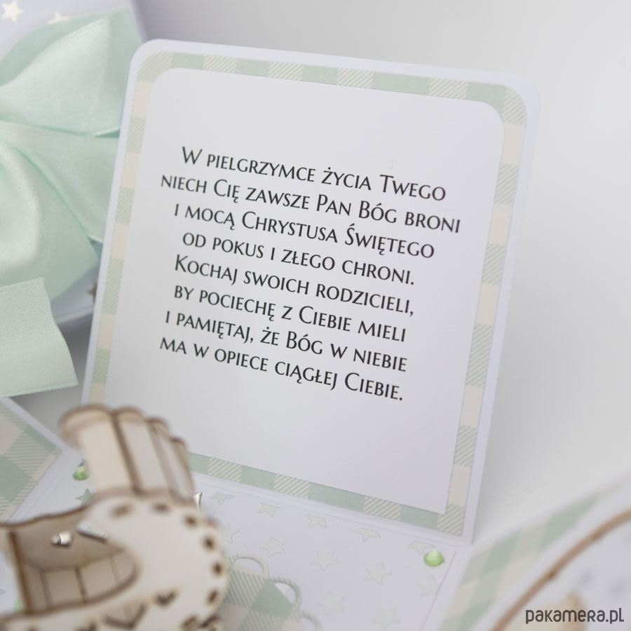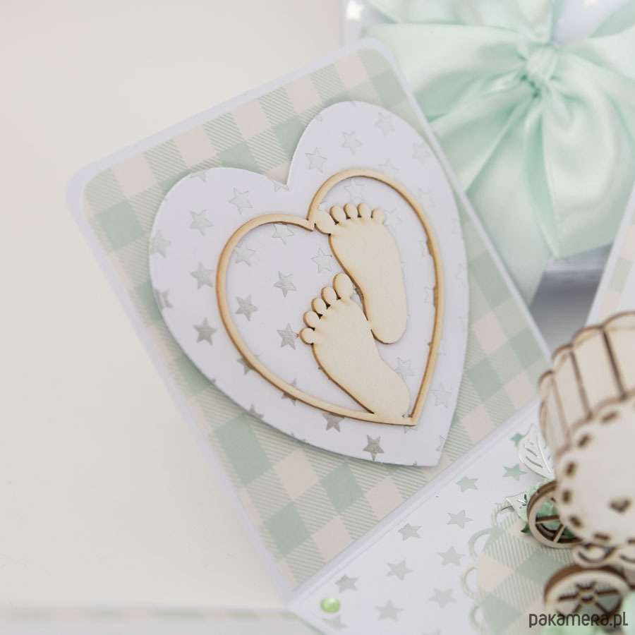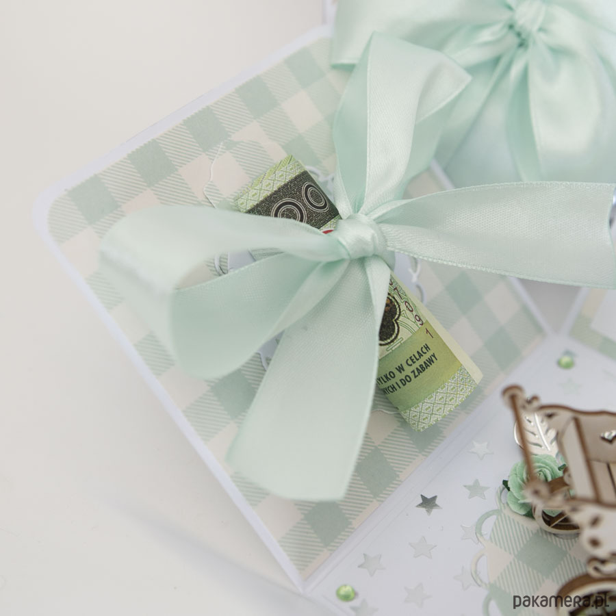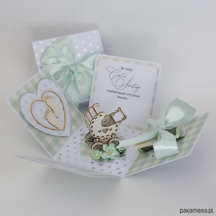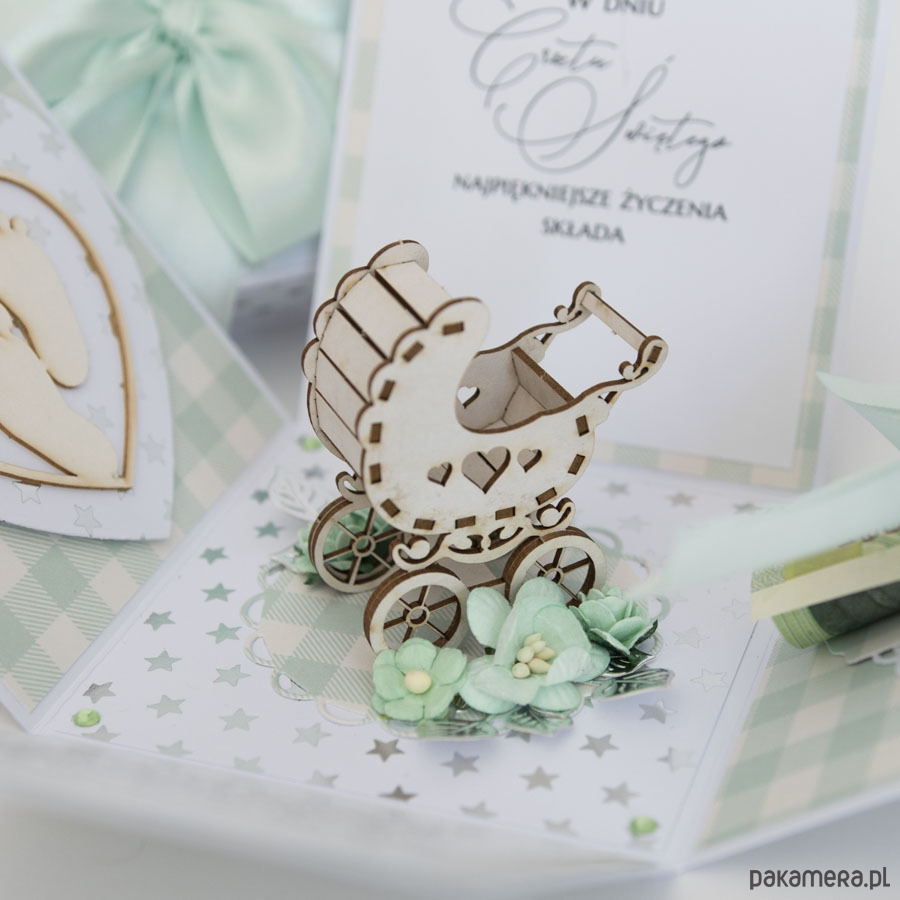 Złożone pudełeczko ma wymiary 10x10x10cm, po rozłożeniu aż 30 cm szerokości. Na ściankach znajduje się miejsce na pieniądze (zwija się je w rulonik i przewiązuje kokardą), motyw dziecięcych stópek, życzenia oraz miejsce na podpis osoby wręczającej prezent. Na środku miniaturowy wózek i papierowe kwiaty.