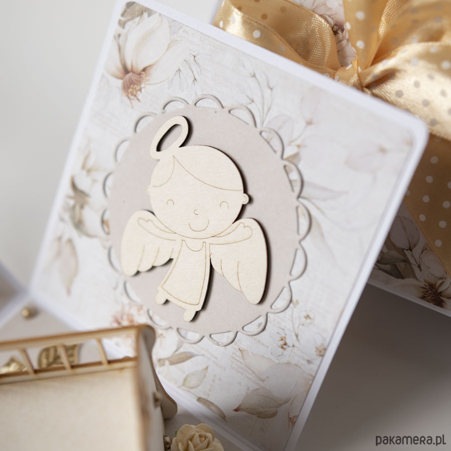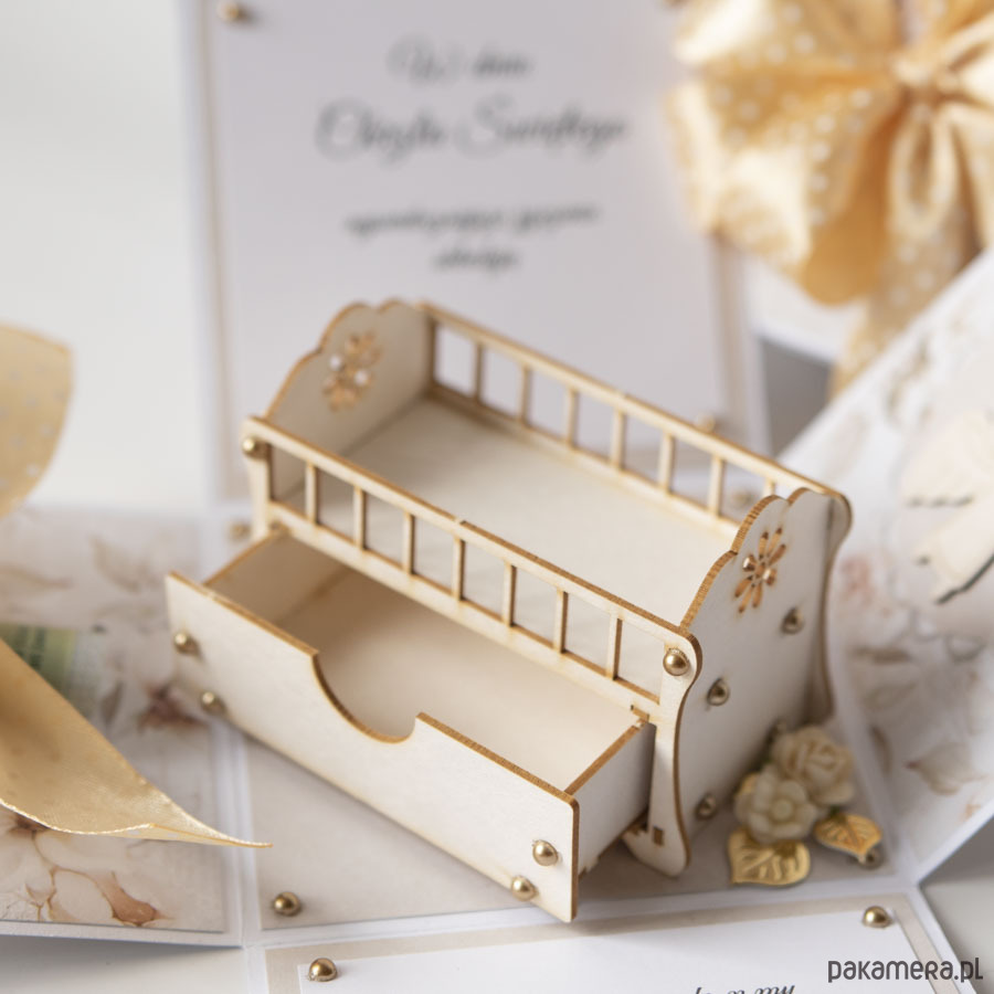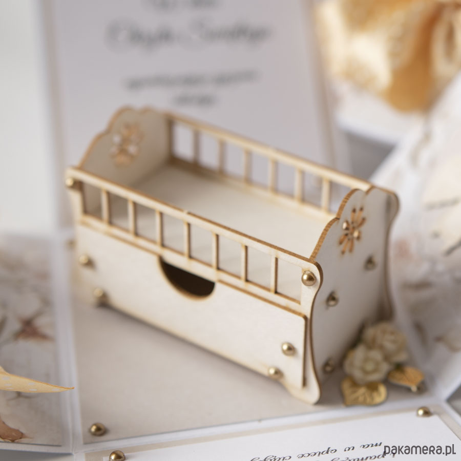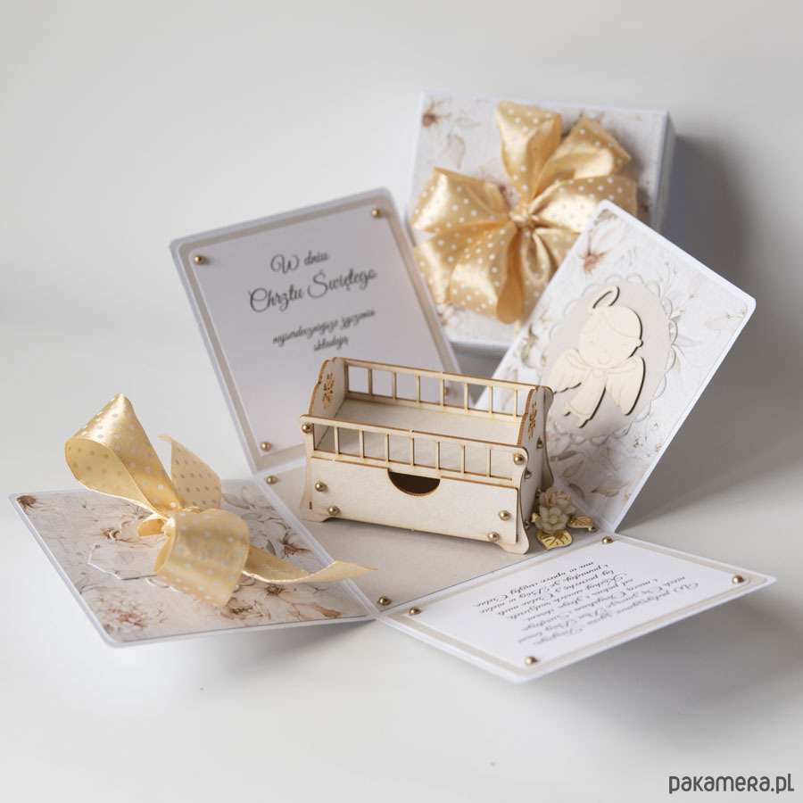 Złożone pudełeczko ma wymiary 10x10x10cm, po rozłożeniu aż 30 cm szerokości. Na ściankach znajduje się miejsce na pieniądze (zwija się je w rulonik i przewiązuje kokardą), motyw aniołka, życzenia oraz miejsce na podpis osoby wręczającej prezent. Na środku miniaturowe łóżeczko z szufladką, która zmieści drobny upominek, np medalik.