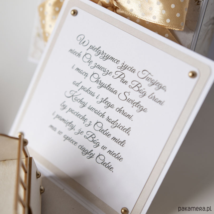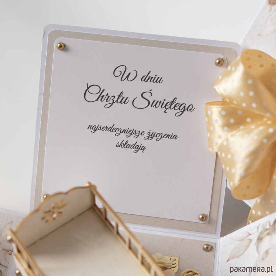 Kremowe "eksplodujące" pudełeczko z rozkładami ściankami, zawierające życzenia z okazji Chrztu Świętego dziecka.