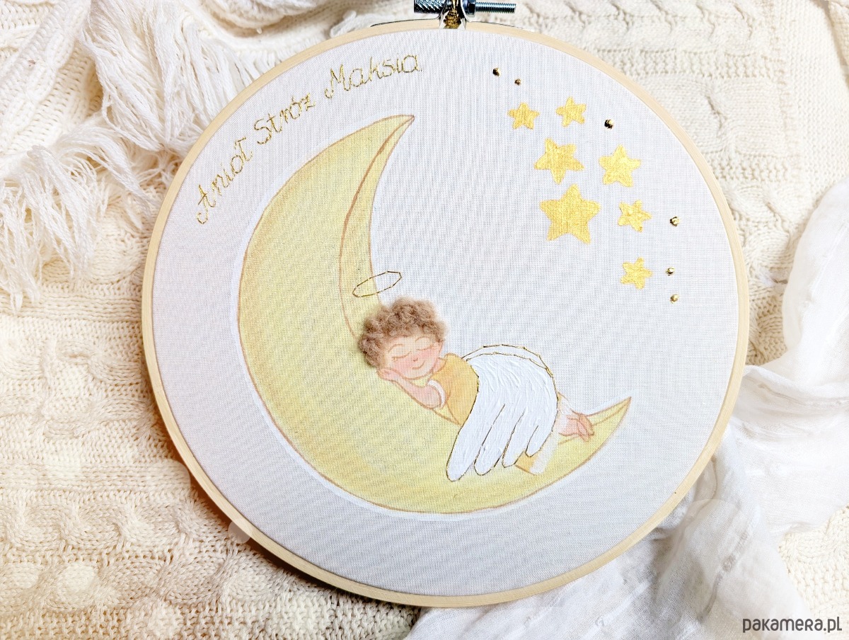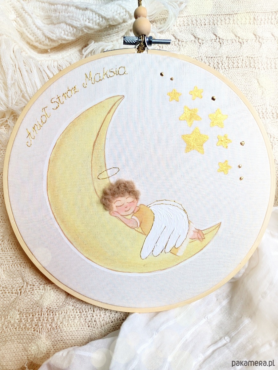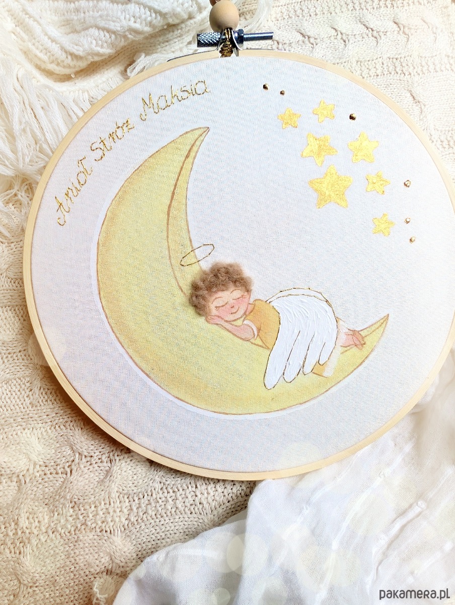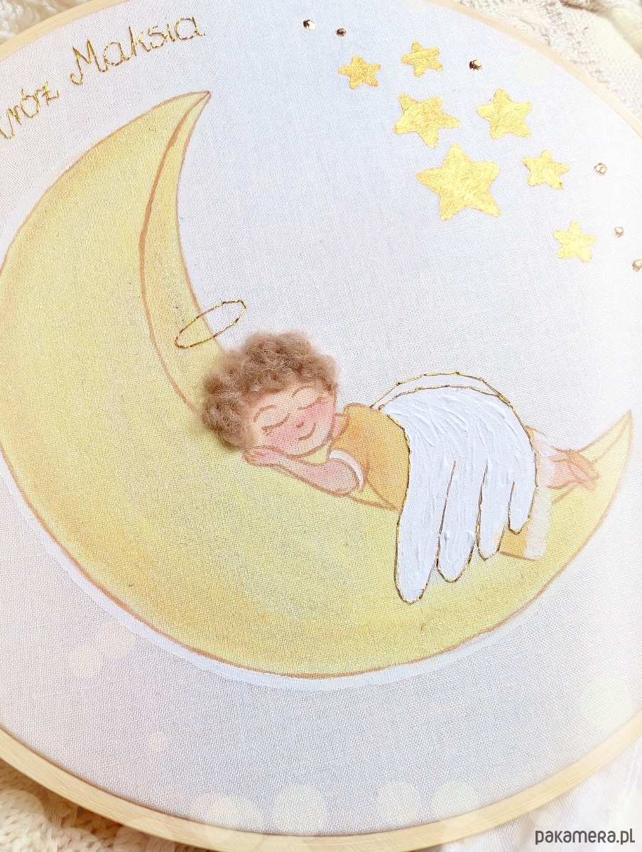 Tamborek został ręcznie namalowany farbami akwarelowymi na płótnie bawełnianym. Skrzydła i aureola są wyhaftowane błyszczącą nicią w kolorze złotym. Efekt 3D tworzą włoski aniołka.
