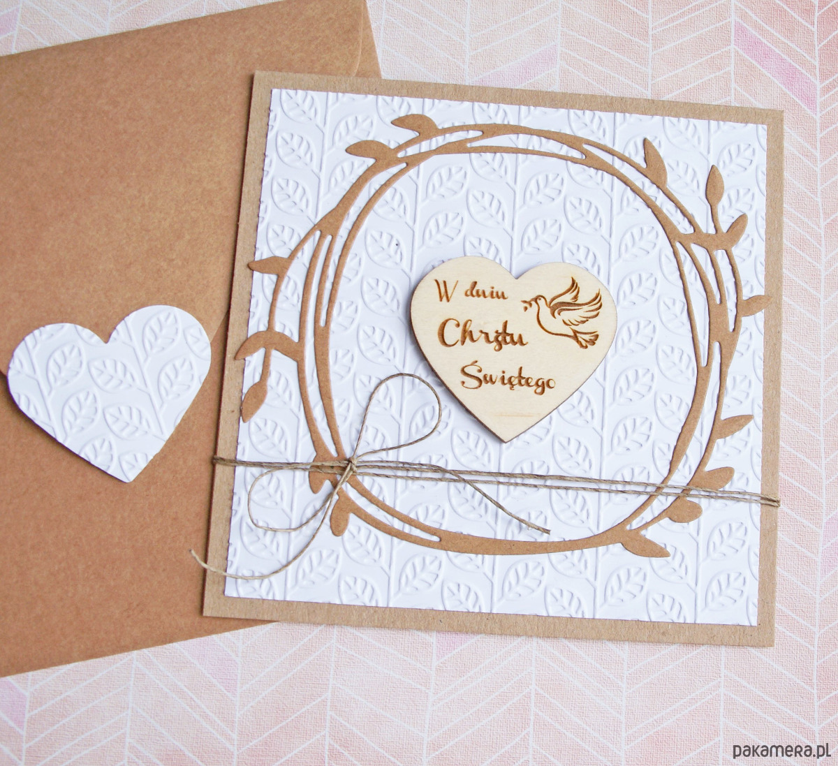 wykonana na bazie grubego, kartonu eko-kraft (100% makulatury) ozdobiona własnoręcznie fakturowanym BIAŁYM kartonem (motyw listków), tekturowym wianuszkiem, drewnianym serduszkiem z głębokim grawerem. przewiązana naturalnym sznurkiem.