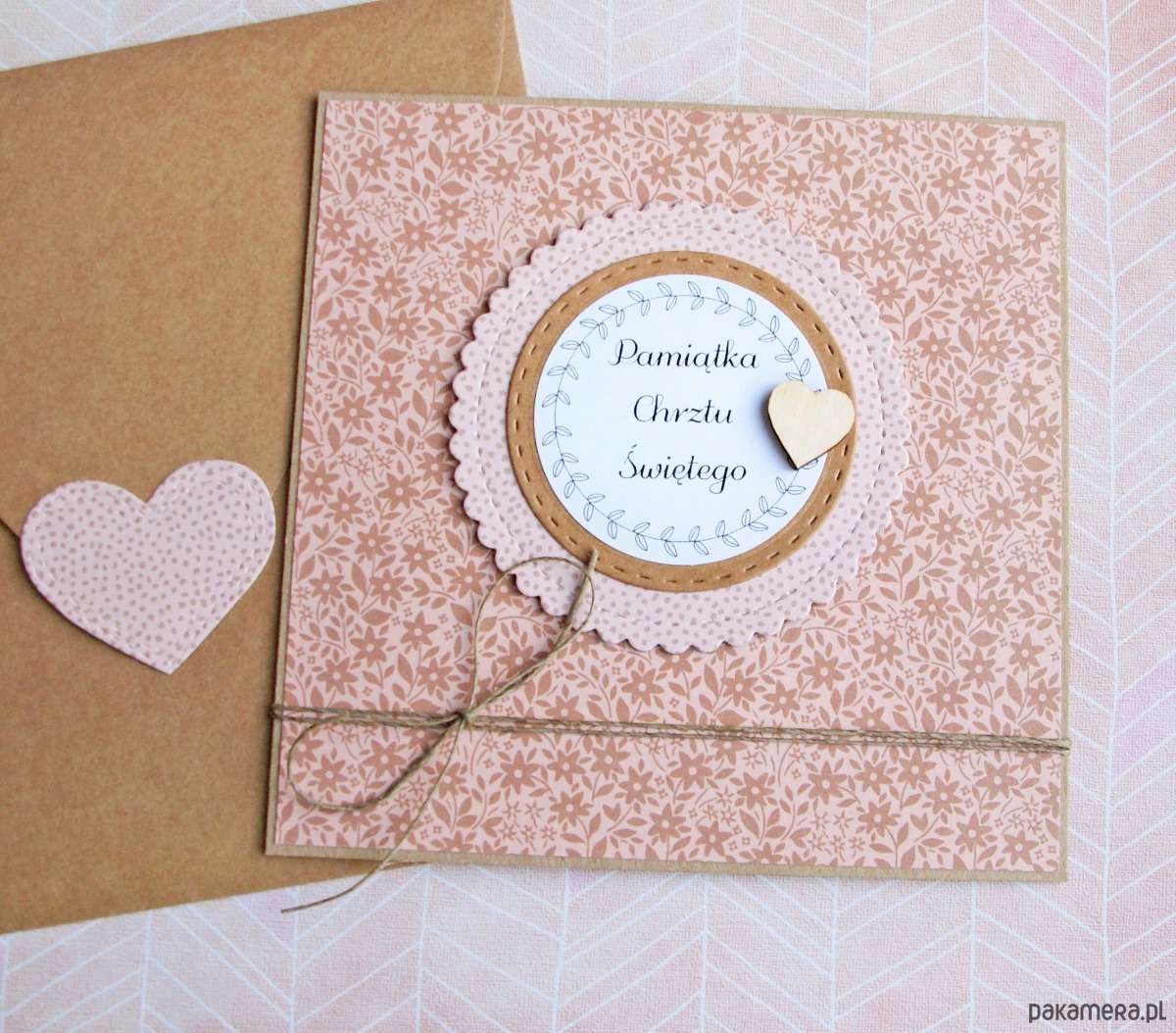 wykonana na bazie grubego kartonu eko-kraft (100% makulatury), ozdobiona wzorzystym papierem , drewnianym serduszkiem, elementem przestrzennym. przewiązana naturalnym sznurkiem.