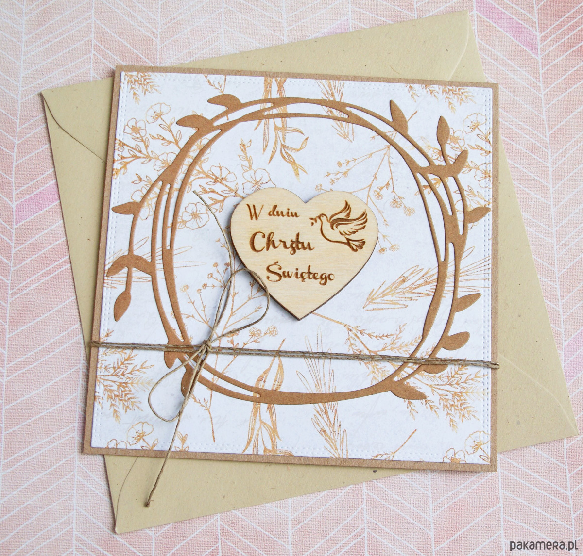 wykonana na bazie grubego, kartonu eko-kraft (100% makulatury) ozdobiona wzorzystym kartonem (motyw roślinny), tekturowym wianuszkiem, drewnianym serduszkiem z głębokim grawerem. przewiązana naturalnym sznurkiem.