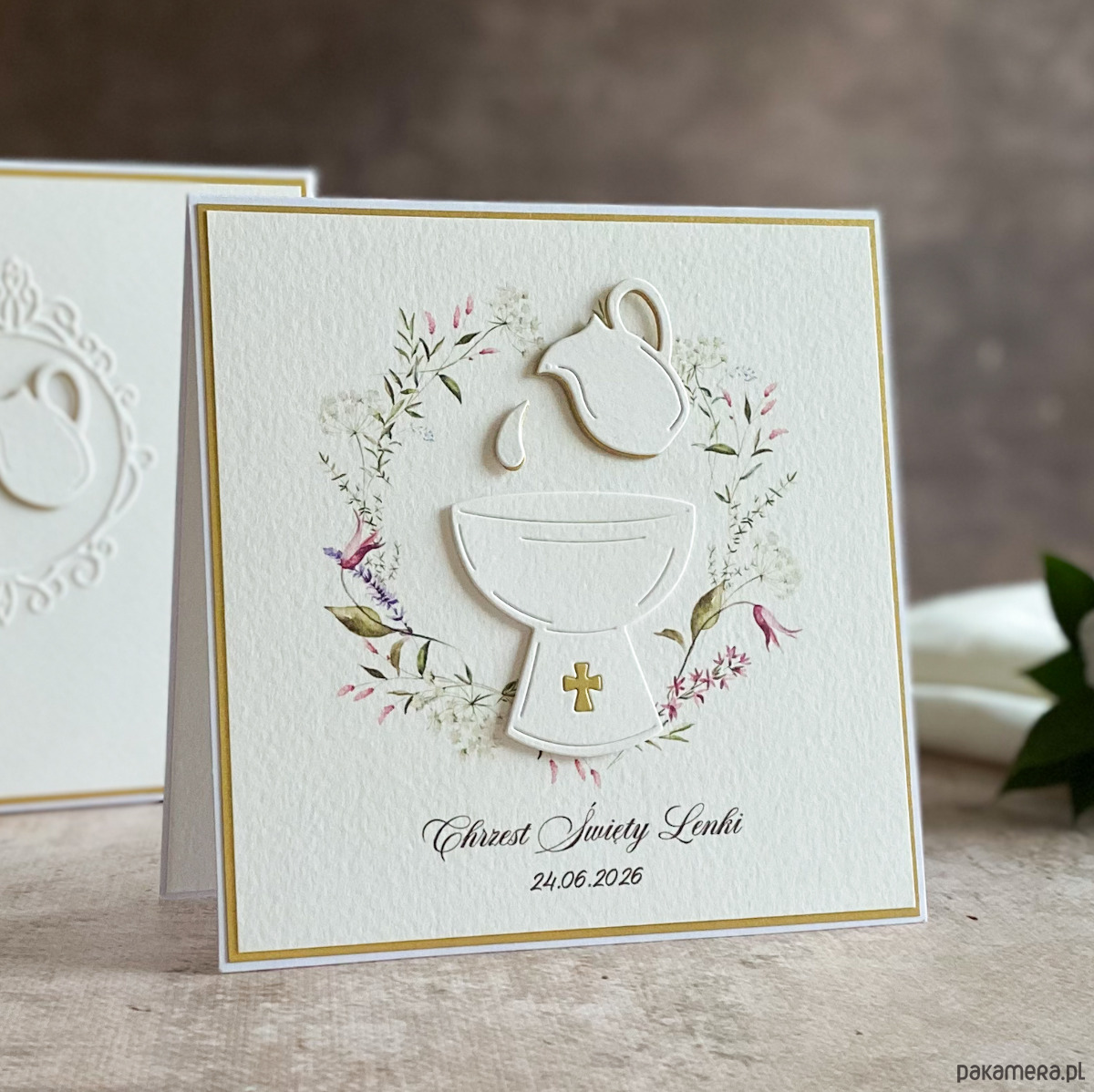 Elegancka, ręcznie wykonana, personalizowana pamiątka chrztu, kartka w pudełku z ozdobną kopertą.