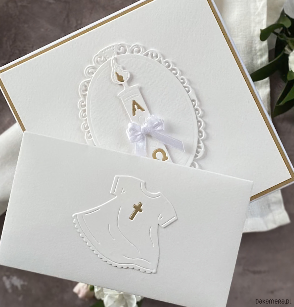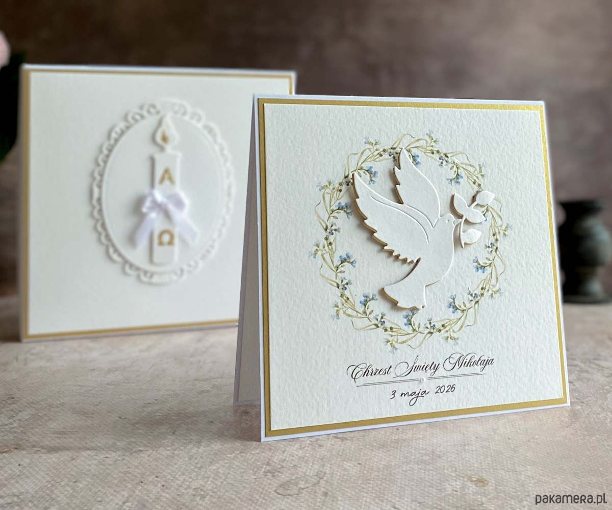 Elegancka, ręcznie wykonana, personalizowana pamiątka chrztu, kartka w pudełku z ozdobną kopertą.