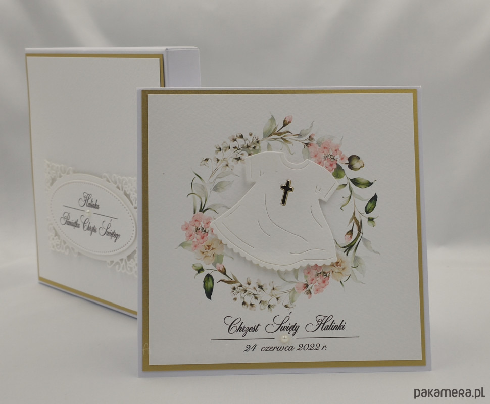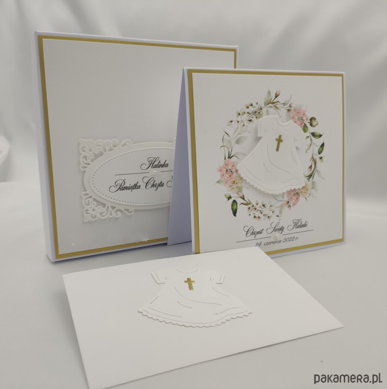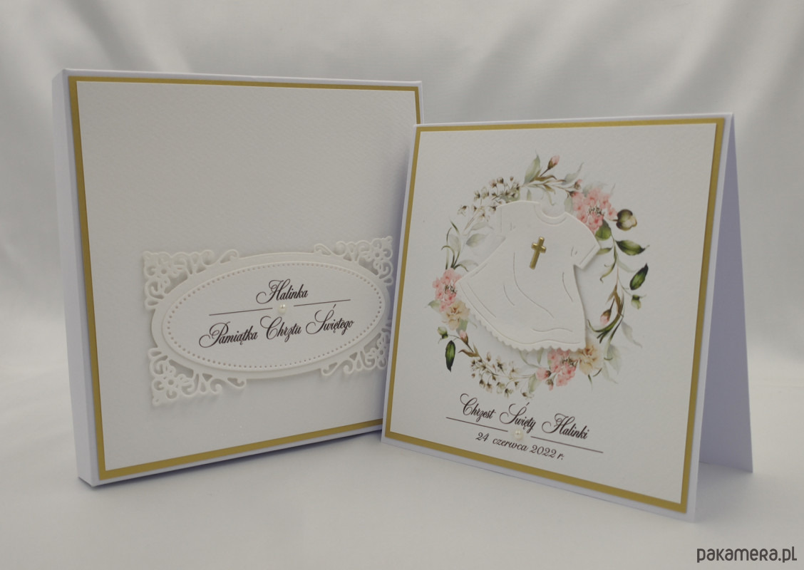Elegancka, ręcznie wykonana pamiątka chrztu, kartka w pudełku z ozdobną kopertą. Delikatne i subtelne połączenie bieli i matowego złota. Idealna pamiątka z okazji chrztu dziewczynki.