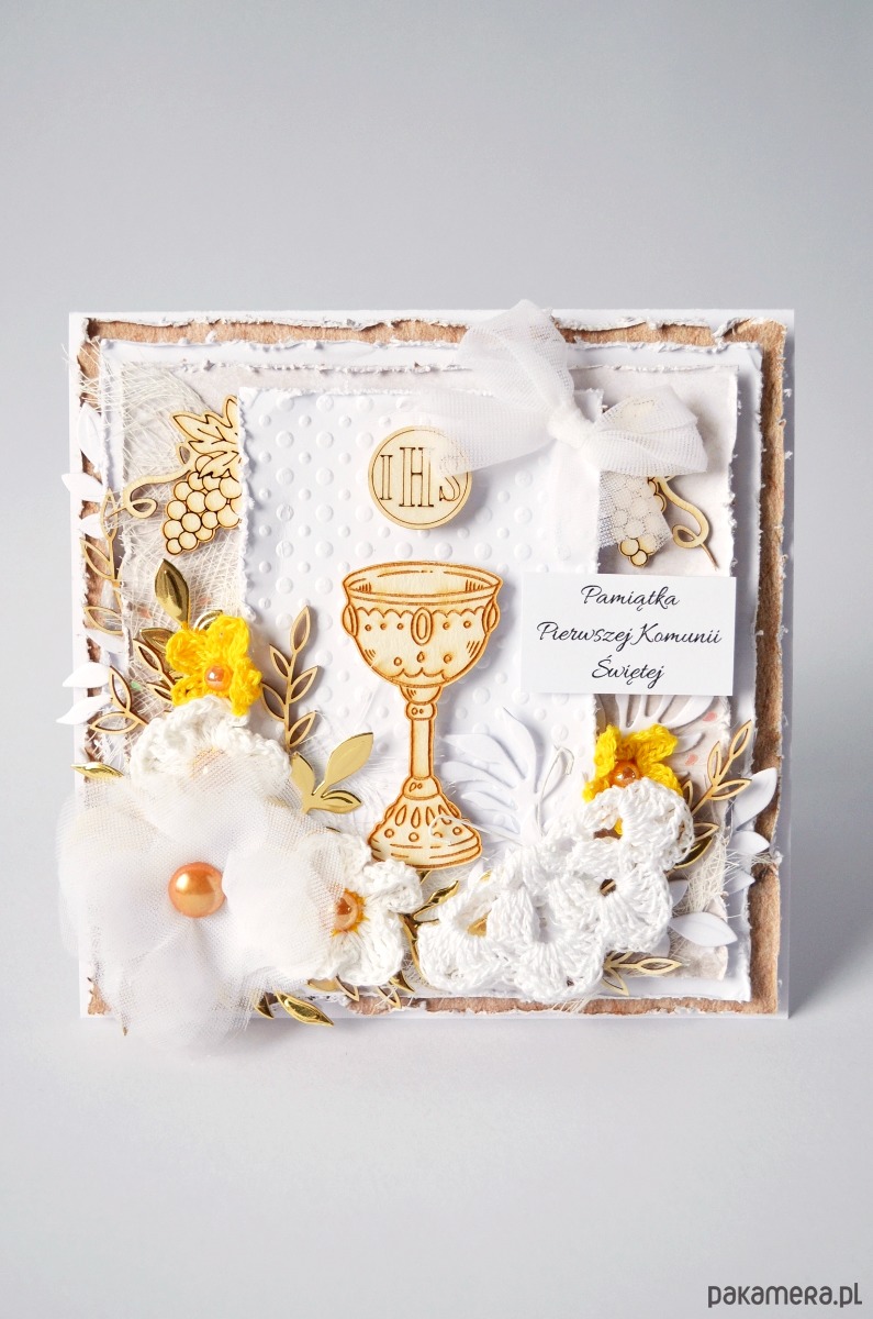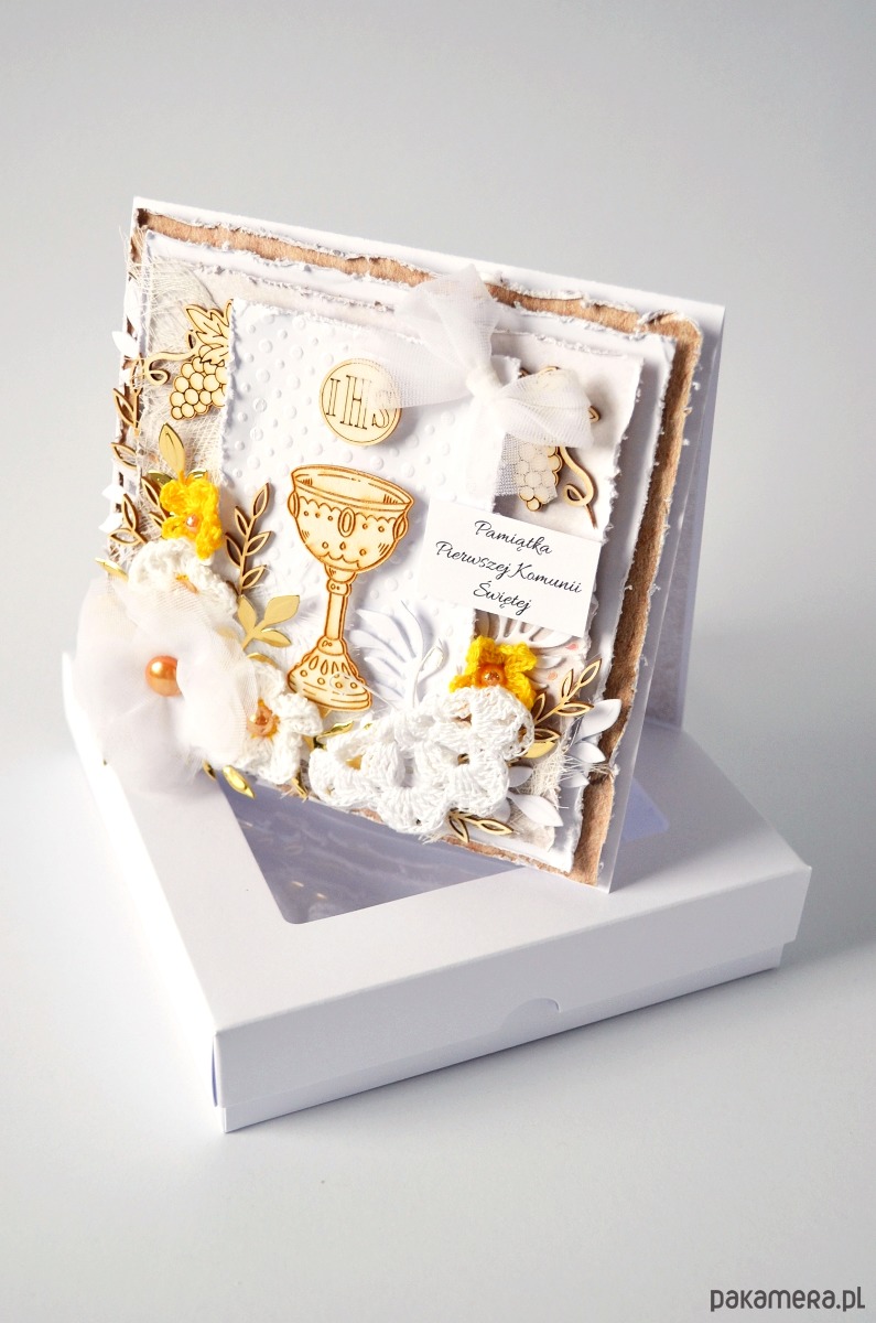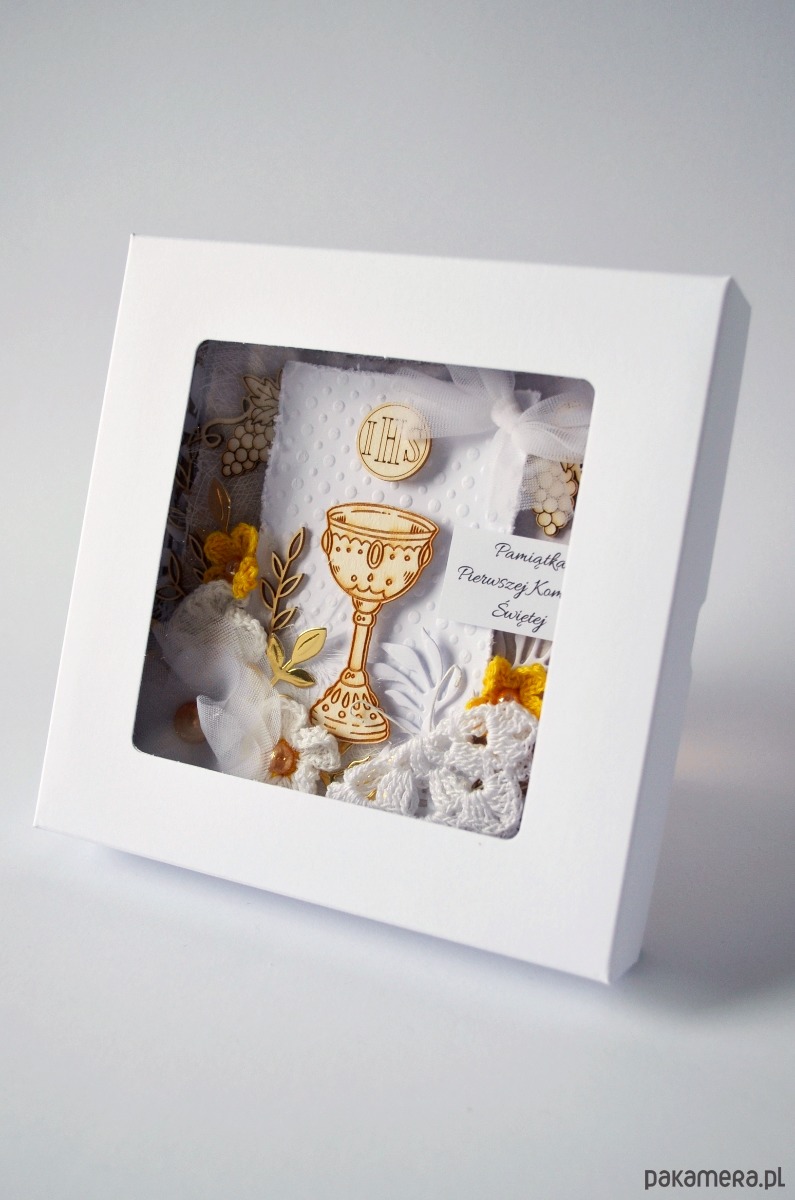 Pamiątka Pierwszej Komunii Świętej w formie warstwowej kartki w białym pudełeczku z przezroczystym okienkiem.