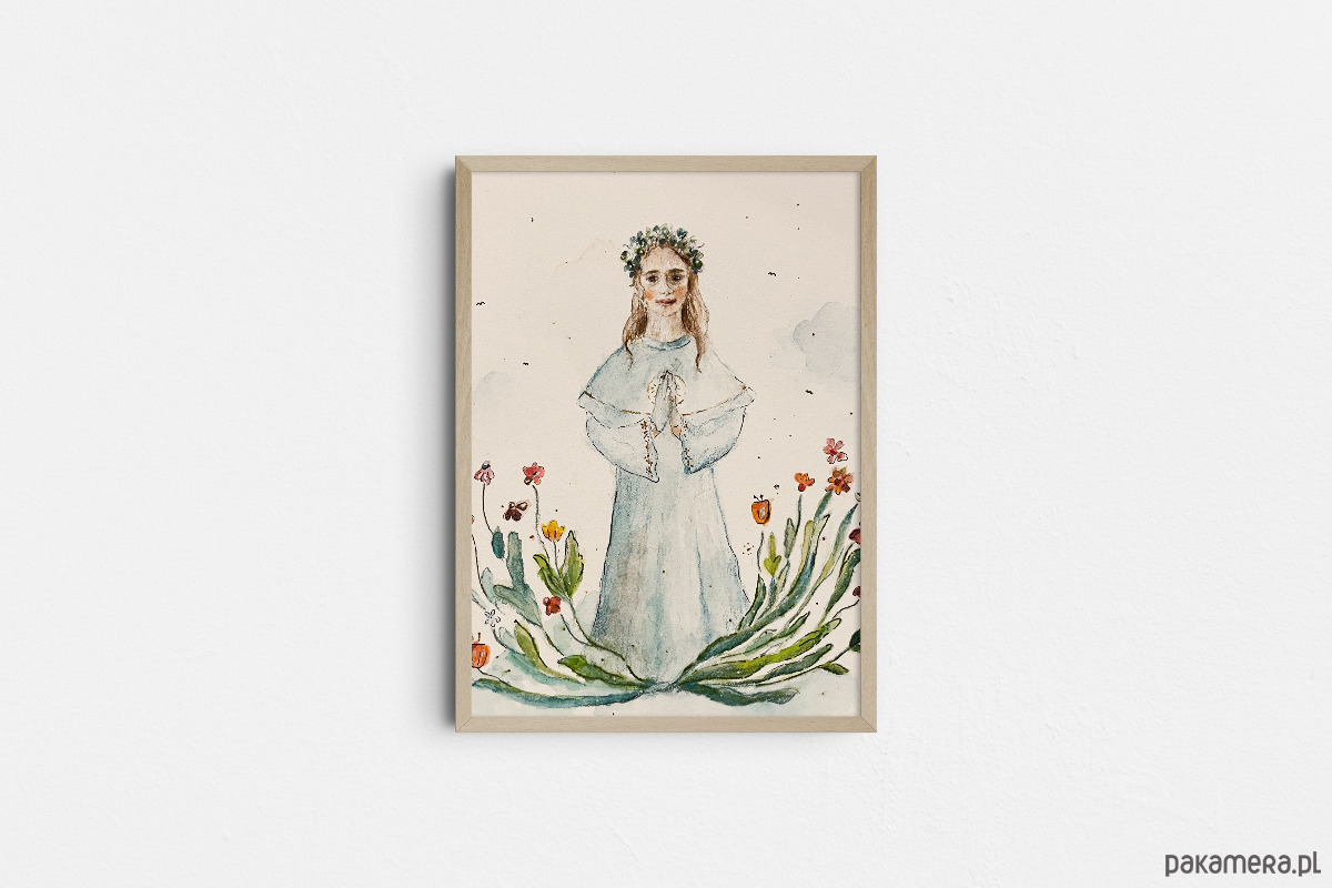 Personalizowana pamiątka Pierwszej Komunii Świętej, która może być namalowana na podstawie przesłanego zdjęcia, lub może być kopią pamiątki widocznej w ofercie.