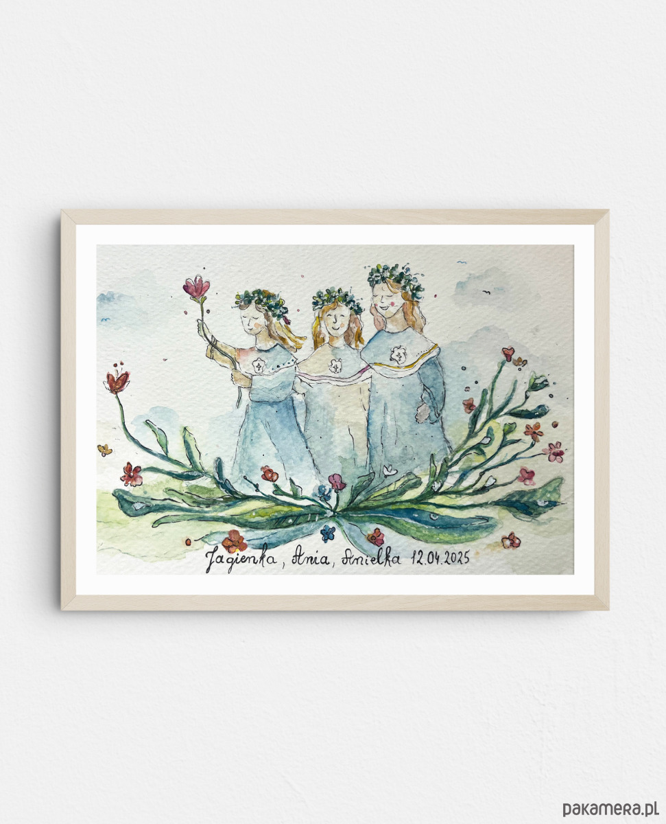 Pamiątka malowana jest akwarelami na profesjonalnym papierze akwarelowym (300g) i może mieć dodany napis z życzeniami lub datą Komunii i imieniem obdarowanej osoby.