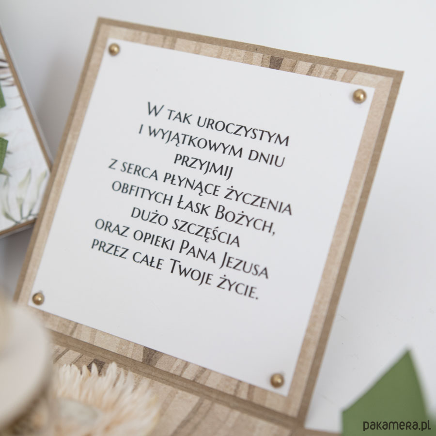 Na środku pudełeczka znajduje się dekoracja - miniaturowy kielich z hostią. Na ściankach znajduje się motyw klęczącego chłopca, życzenia dla dziecka, miejsce na odręczny podpis osoby wręczającej prezent oraz miejsce na pieniądze (zwija się je w rulonik i przewiązuje satynową kokardą.
