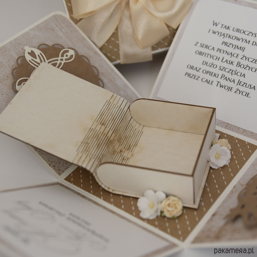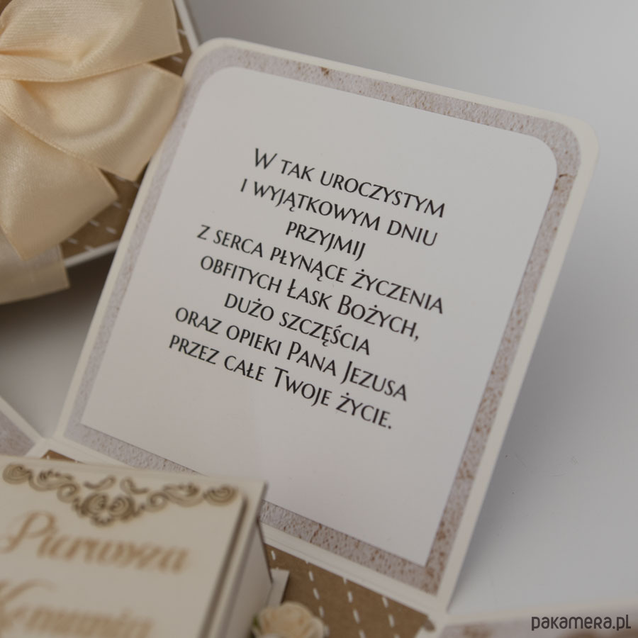 Na środku pudełeczka znajduje się dekoracja - miniaturowa księga otoczony papierowymi kwiatuszkami, która może pełnić jednocześnie funkcję opakowania na drobny prezent taki jak np. medalik, bransoletkę. Na ściankach znajduje się motyw krzyża, życzenia dla dziecka, miejsce na odręczny podpis osoby wręczającej prezent oraz miejsce na pieniądze (zwija się je w rulonik i przewiązuje satynową kokardą.