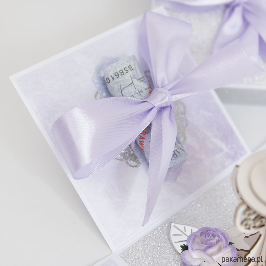 Wymiary złożonego pudełka to 10x10x10cm, po rozłożeniu kartka ma aż 30cm szerokości! Całość utrzymana jest w delikatnych, stonowanych barwach.