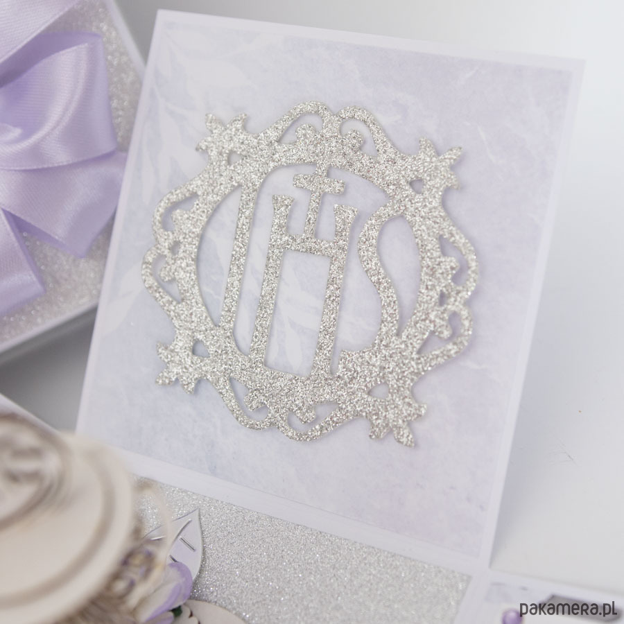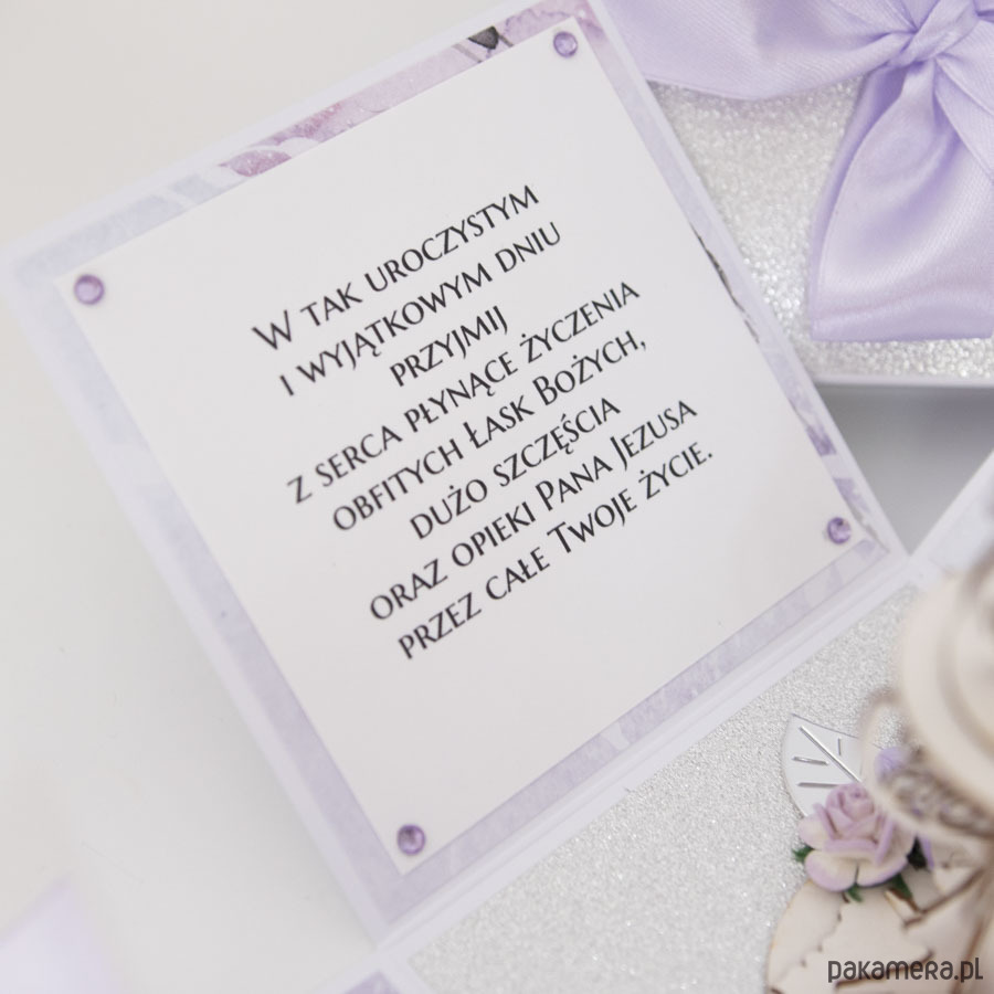 Na środku pudełeczka znajduje się dekoracja - miniaturowy kielich z hostią. Na ściankach znajduje się motyw hostii, życzenia dla dziecka, miejsce na odręczny podpis osoby wręczającej prezent oraz miejsce na pieniądze (zwija się je w rulonik i przewiązuje satynową kokardą.