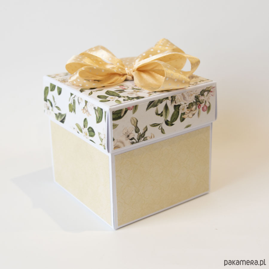 Ręcznie robiona kartka w kształcie rozkładanego, "ekspolodującego" po zdjęciu pokrywki pudełeczka.
