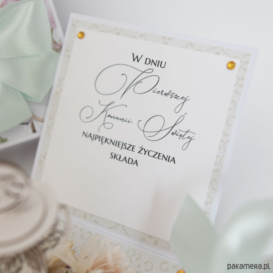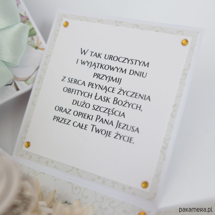 Na środku pudełeczka znajduje się dekoracja - miniaturowy kielich z hostią. Na ściankach znajduje się motyw krzyża, życzenia dla dziecka, miejsce na odręczny podpis osoby wręczającej prezent oraz miejsce na pieniądze (zwija się je w rulonik i przewiązuje satynową kokardą.