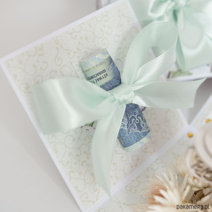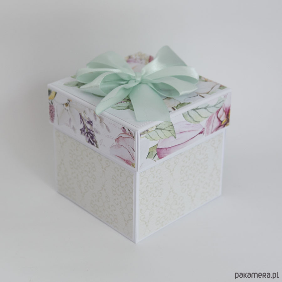 Wymiary złożonego pudełka to 10x10x10cm, po rozłożeniu kartka ma aż 30cm szerokości! Całość utrzymana jest w delikatnych, stonowanych barwach.