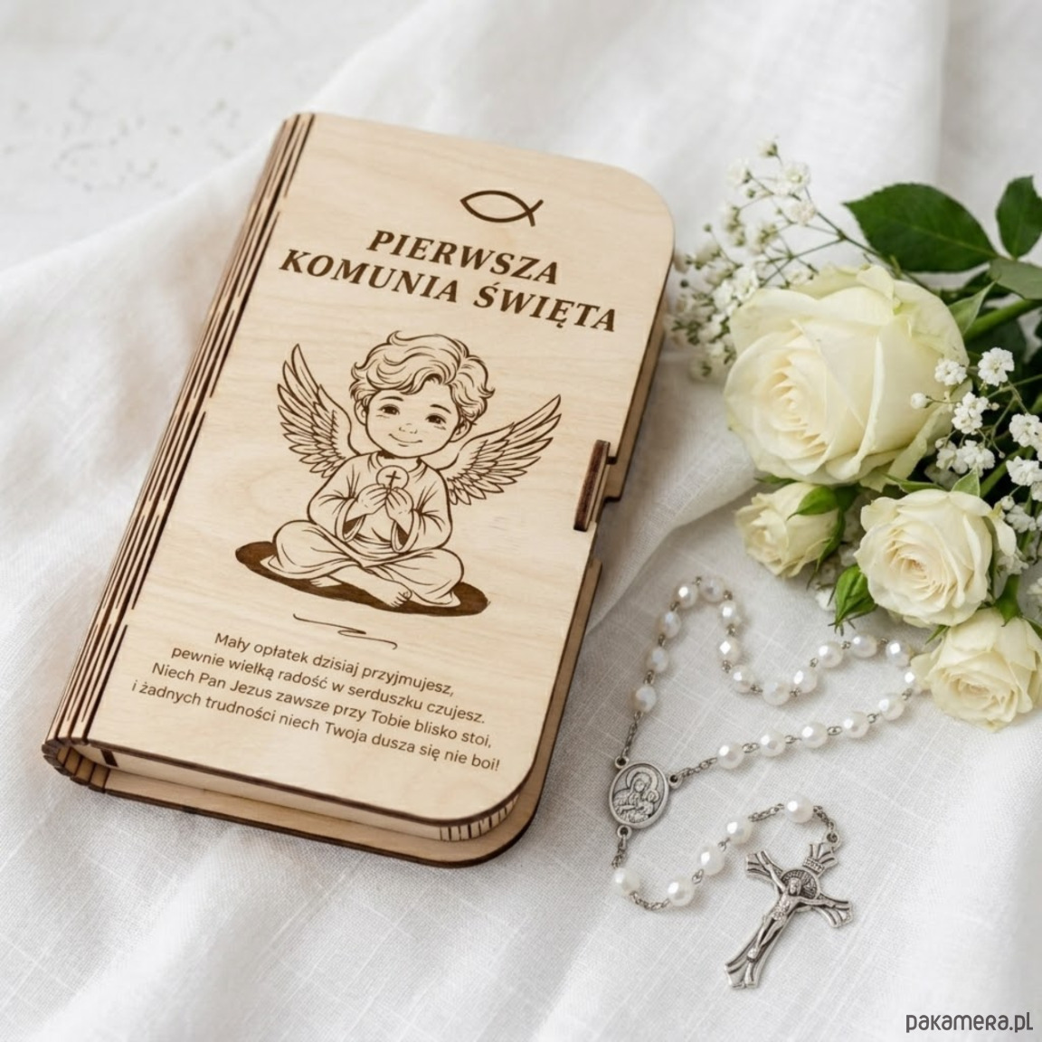 To nowoczesna alternatywa dla tradycyjnej koperty – bardziej elegancka, bardziej osobista i zdecydowanie bardziej wyjątkowa. Drewniane pudełko na pieniądze może być później wykorzystywane do przechowywania pamiątek komunijnych, stając się symbolicznym wspomnieniem tego ważnego dnia.