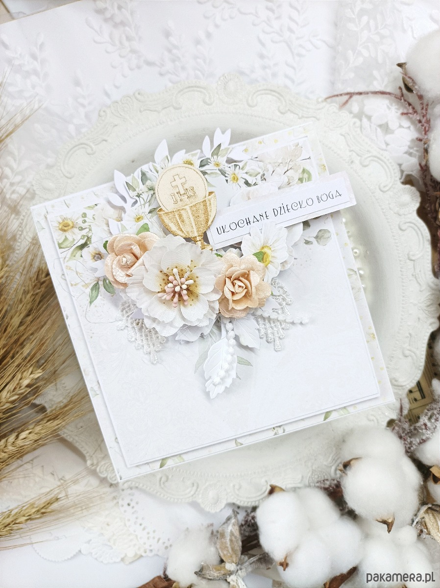 Karteczka wykonana z wysokiej jakości papieru scrapbookingowego, ozdobiona ręcznie tworzonymi kwiatami z tkaniny, koronkami, papierowymi serwetkami i gałązkami.
