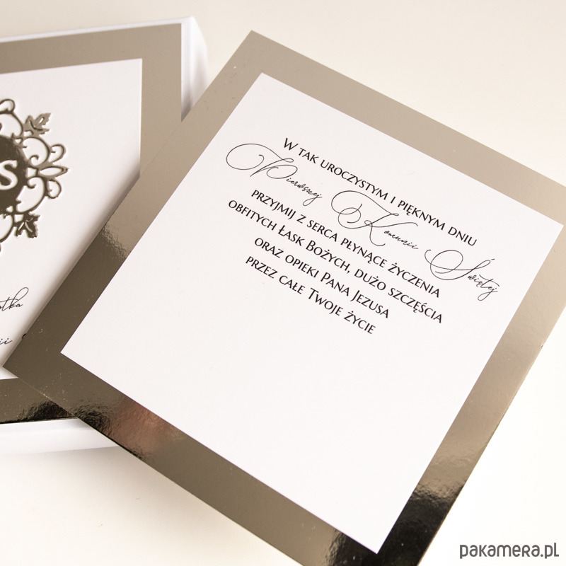 Biało-srebrne, lustrzane pudełeczko o wymiarach około 15x15cm, w środku znajduje się sztywna karta z treścią życzeń.