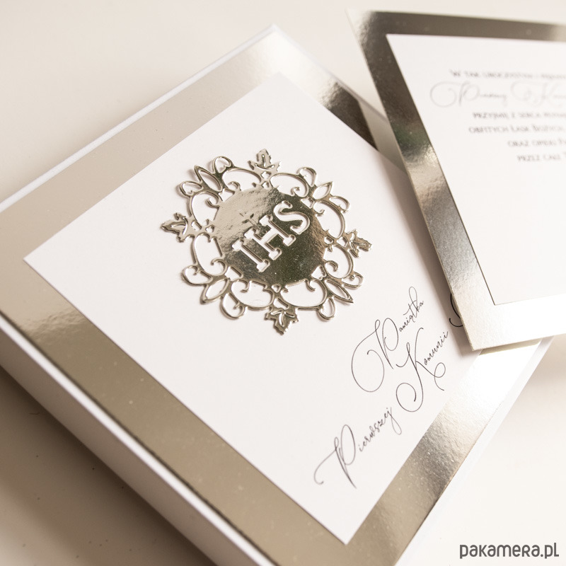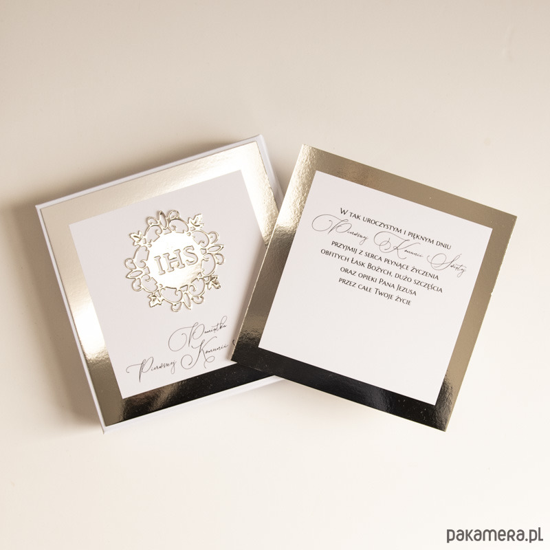 Biało-srebrne, lustrzane pudełeczko o wymiarach około 15x15cm, w środku znajduje się sztywna karta z treścią życzeń.