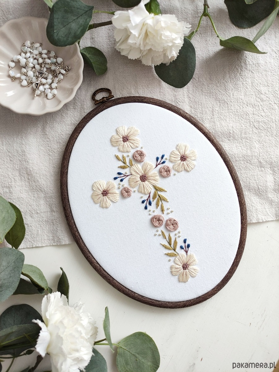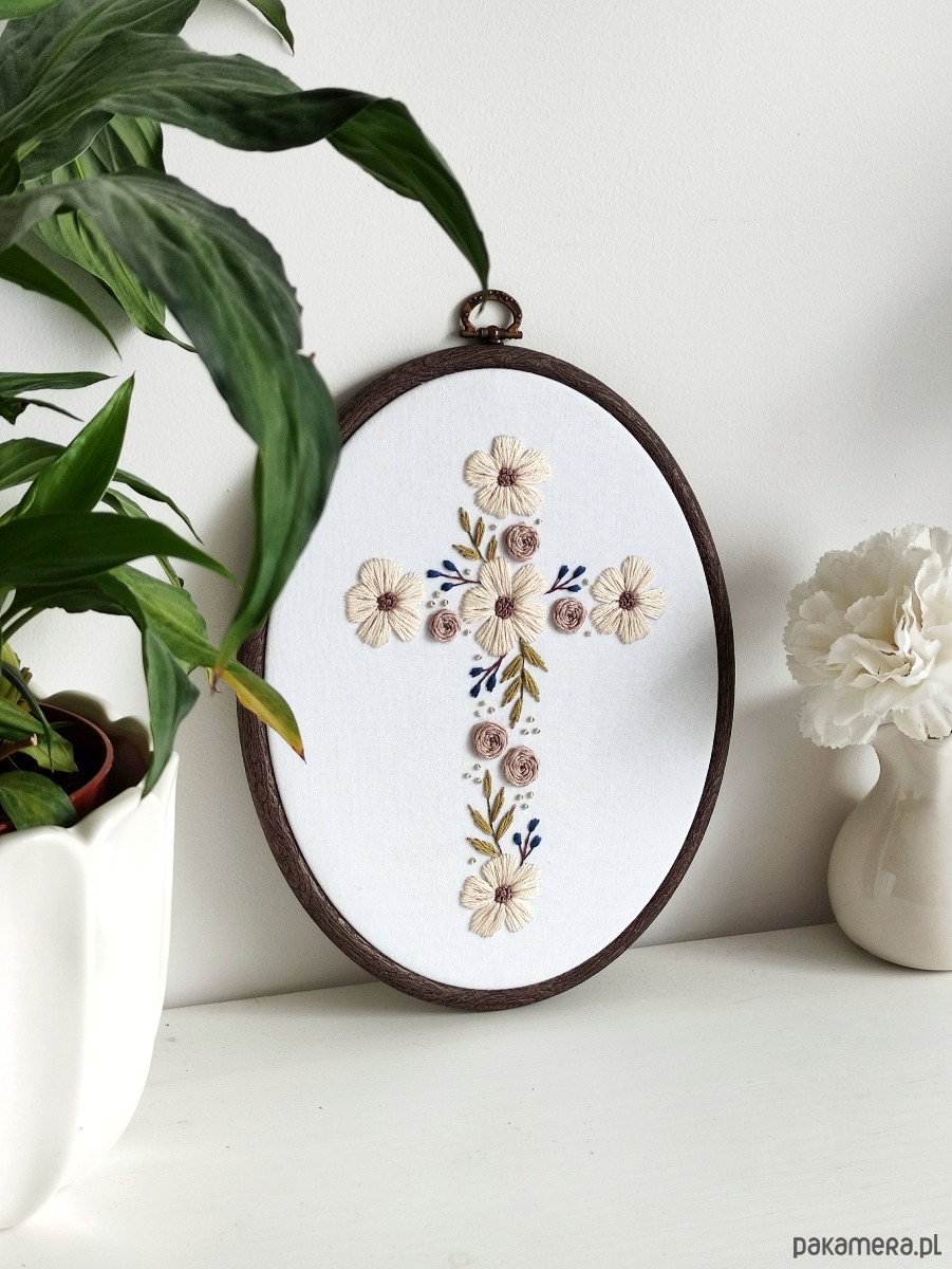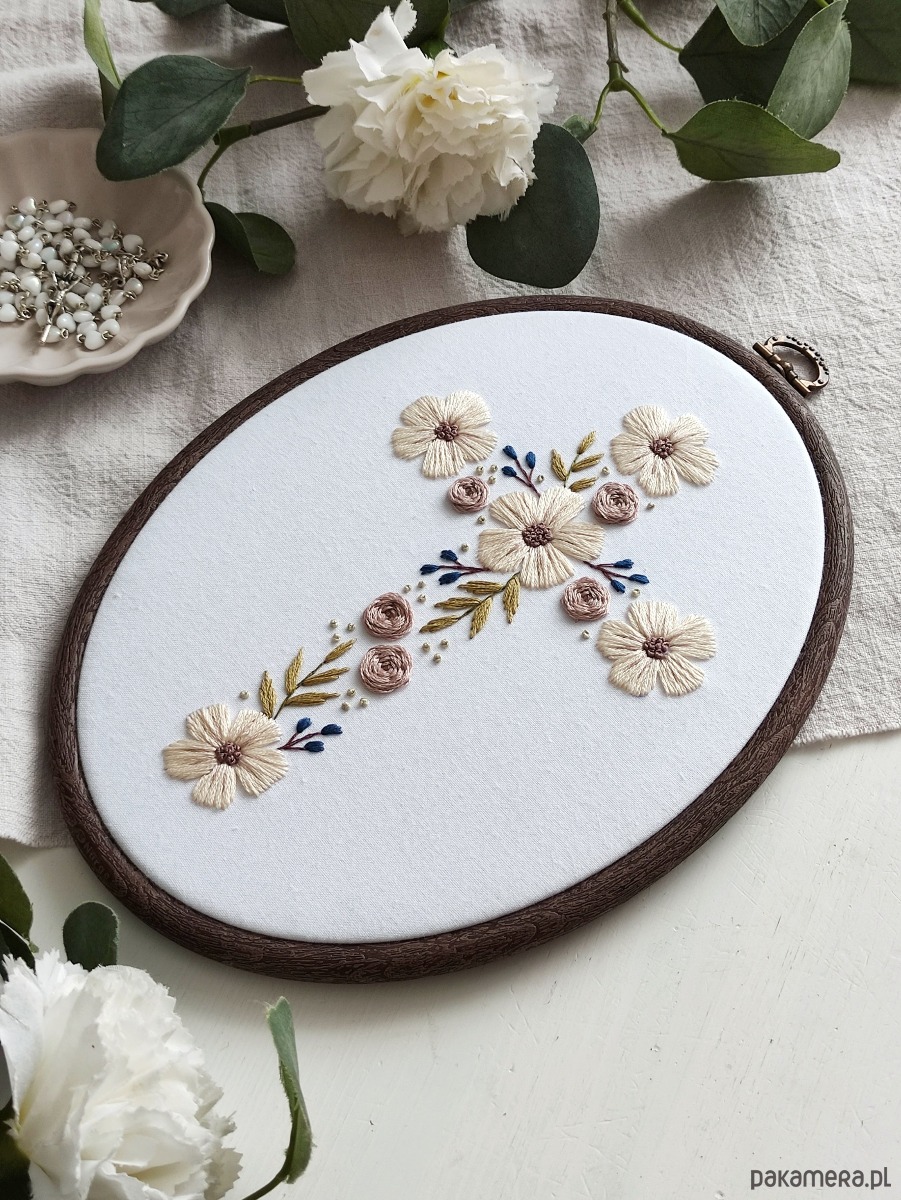 Ręcznie haftowany owalny obrazek z krzyżem – wym. 18×23 cm.