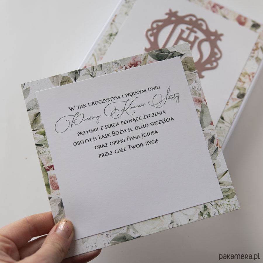 Biało-kwiatowe pudełeczko o wymiarach około 15x15cm, w środku znajduje się sztywna karta z treścią życzeń oraz koperta na pieniądze.