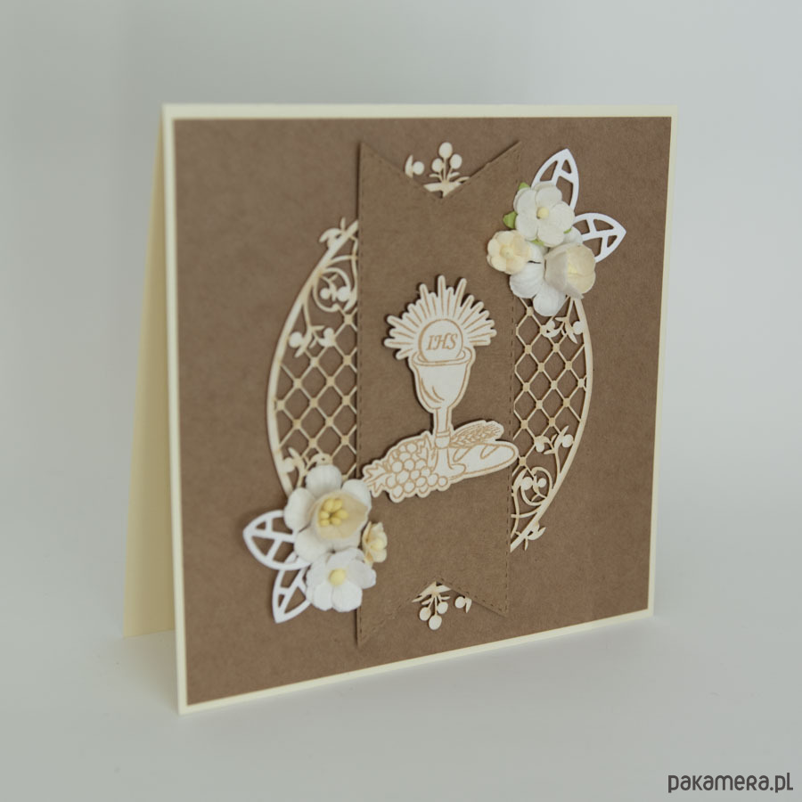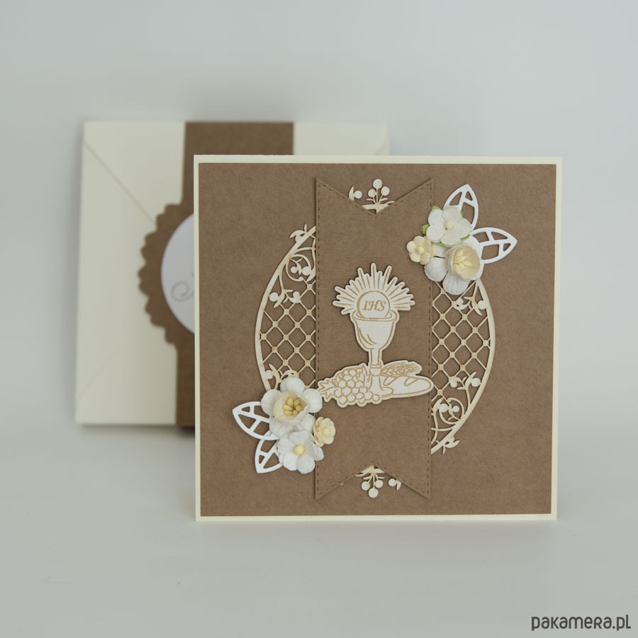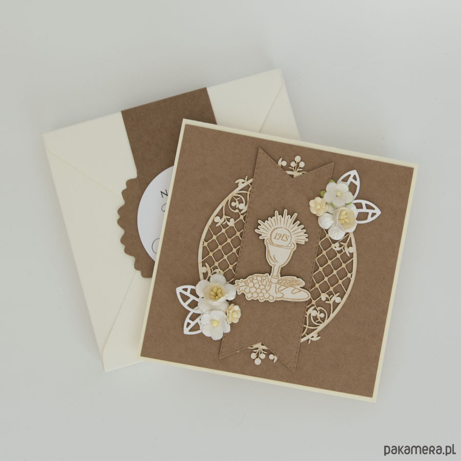 Pamiątka ozdobiona została kielichem z hostią oraz papierowymi kwiatuszkami.
