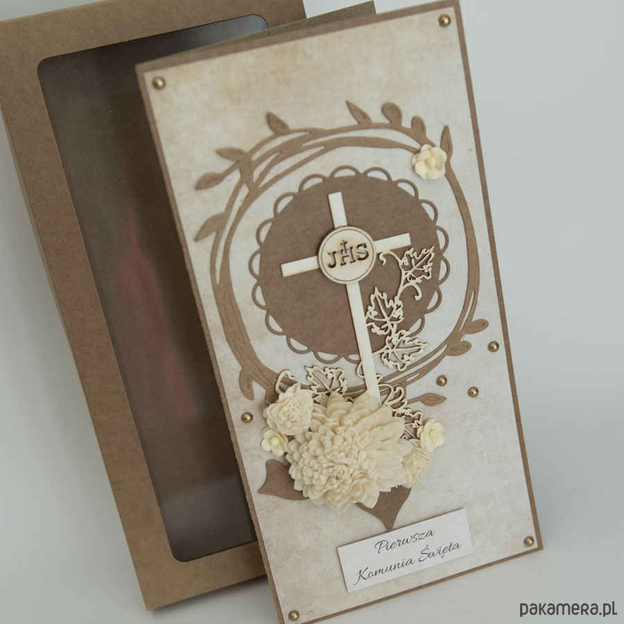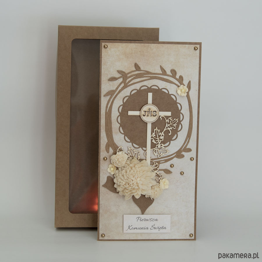 Ręcznie robiona kartka z okazji Pierwszej Komunii Świętej dziecka w komplecie z pudełeczkiem.