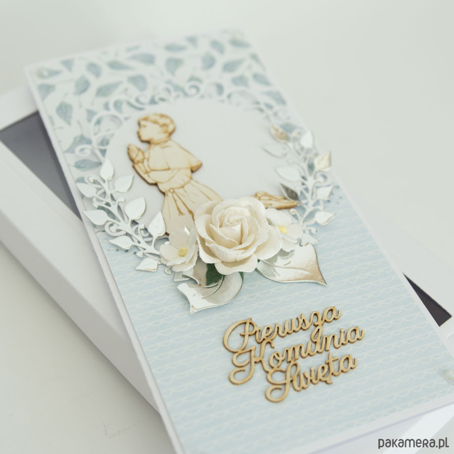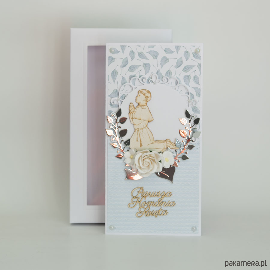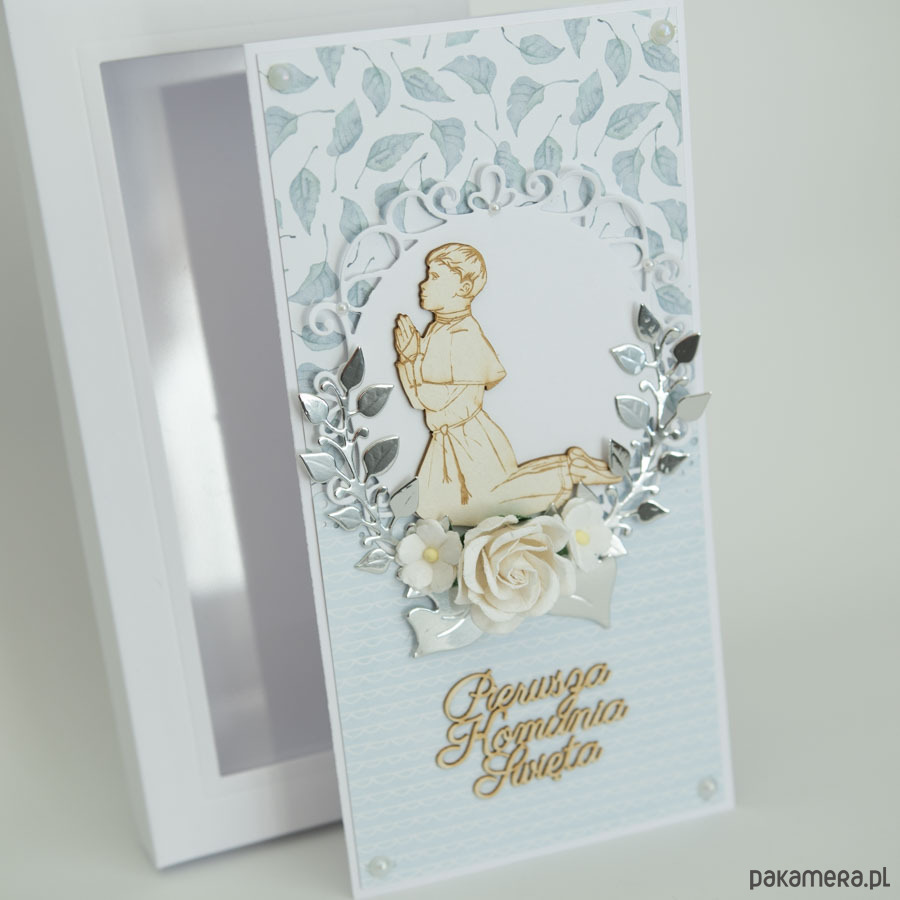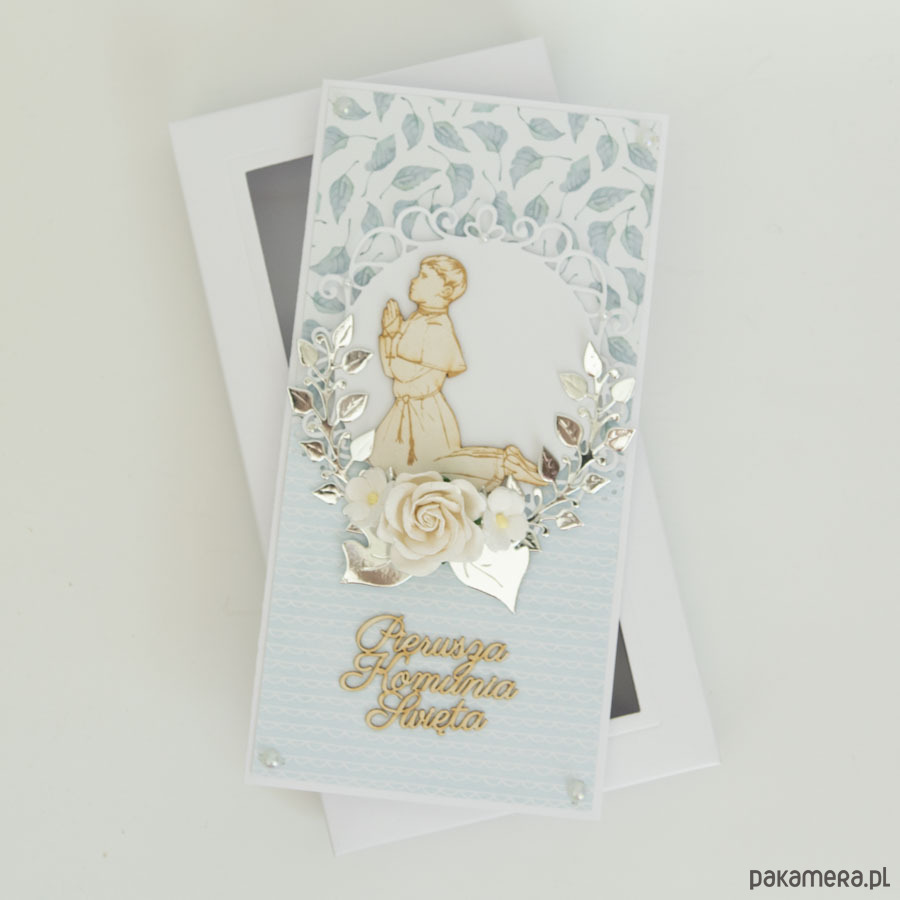 Ręcznie robiona kartka z okazji Pierwszej Komunii Świętej chłopca w komplecie z pudełeczkiem.