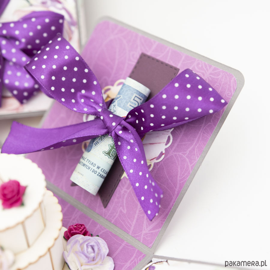 Na środku pudełeczka znajduje się dekoracja - miniaturowy tort z papierowymi kwiatami, na ściankach motyw serca, życzenia dla Nowożeńców, miejsce na podpis oraz miejsce na pieniądze lub kupony lotto (zwija się je w rulonik i przewiązuje kokardą).
