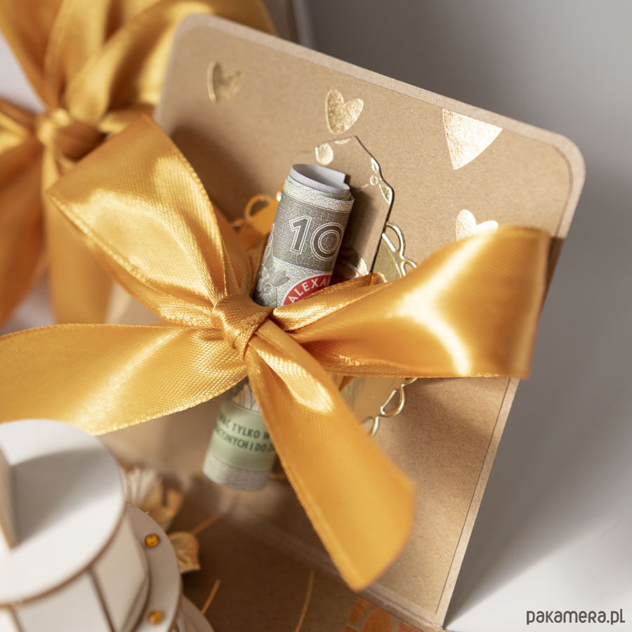 Na środku pudełeczka znajduje się dekoracja - miniaturowy tort z suszonymi kwiatami, na ściankach motyw serca, życzenia dla Nowożeńców, miejsce na podpis oraz miejsce na pieniądze lub kupony lotto (zwija się je w rulonik i przewiązuje kokardą).