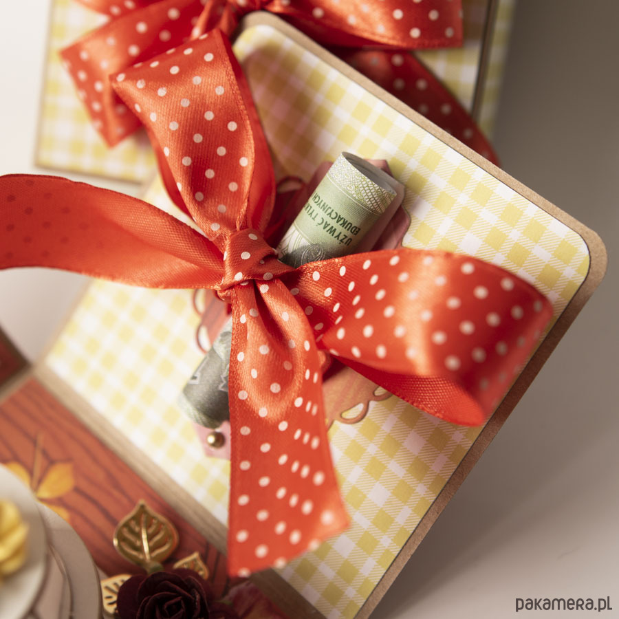 Na środku pudełeczka znajduje się dekoracja - miniaturowy tort z papierowymi kwiatami, na ściankach motyw serc, życzenia dla Nowożeńców, miejsce na podpis oraz miejsce na pieniądze lub kupony lotto (zwija się je w rulonik i przewiązuje kokardą).