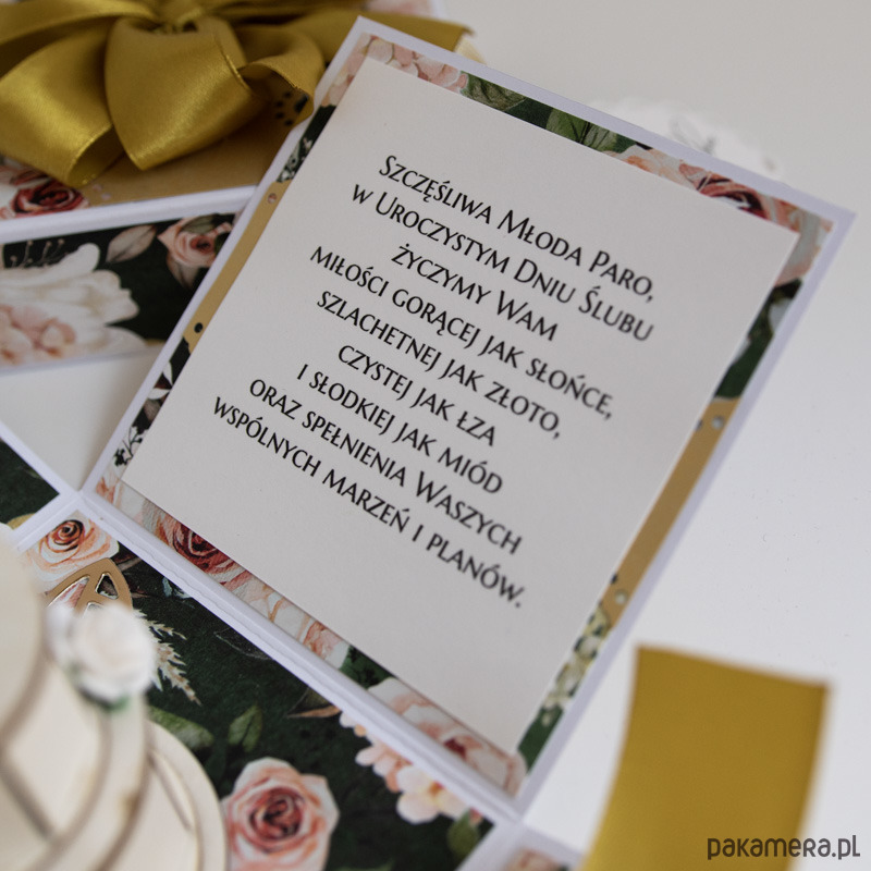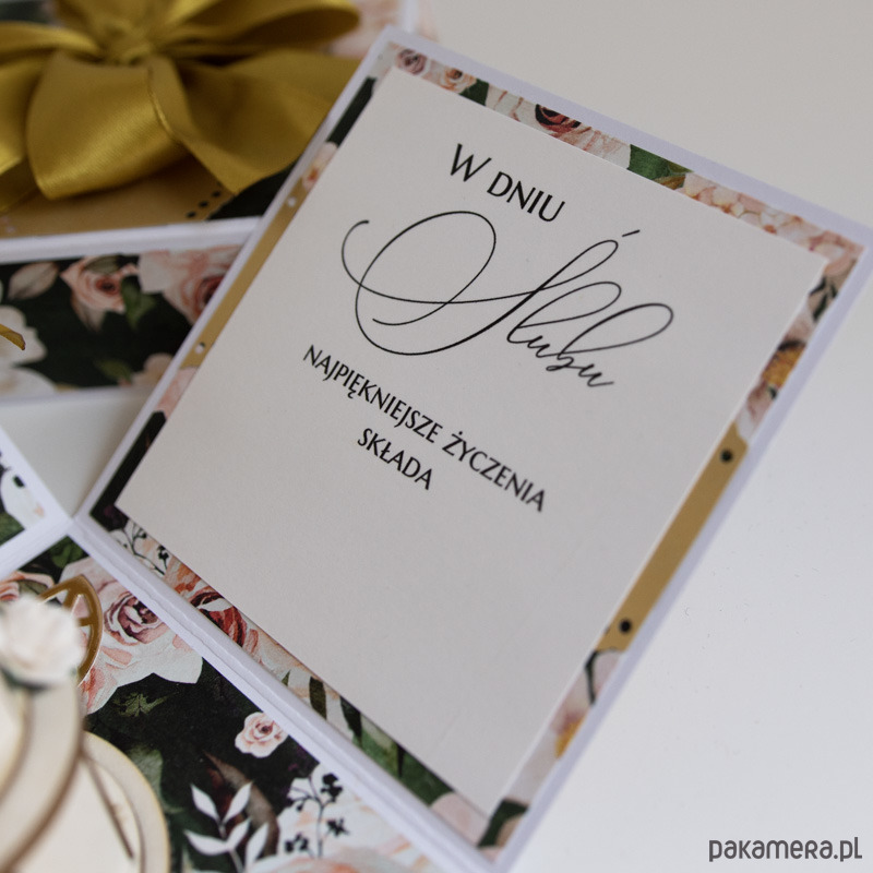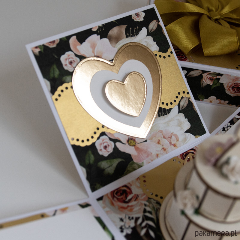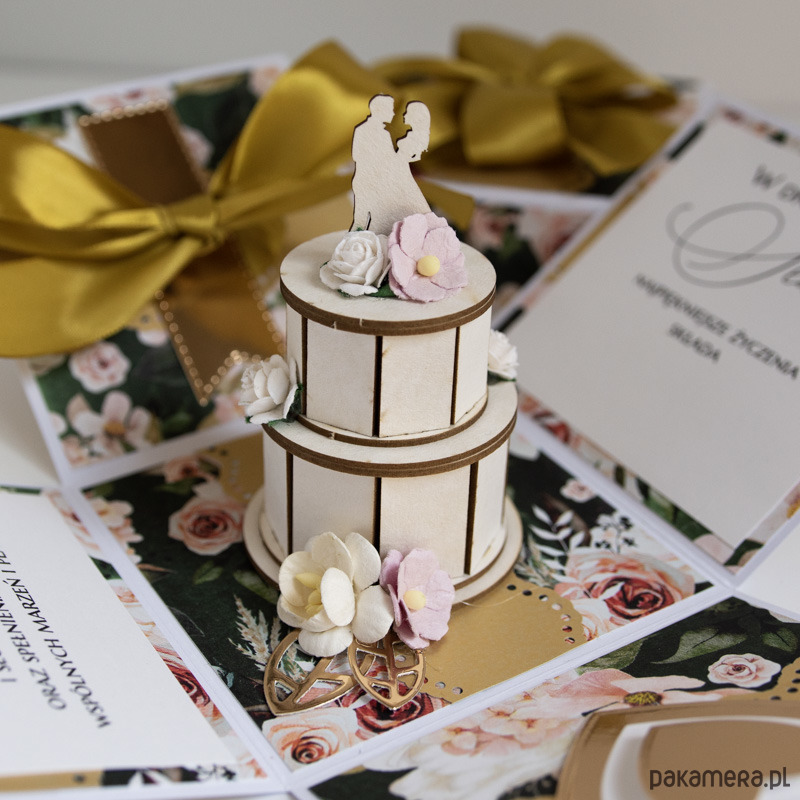 Na środku pudełeczka znajduje się dekoracja - miniaturowy tort z kwiatami i parą młodą, na ściankach motyw serca, życzenia dla Nowożeńców, miejsce na podpis oraz miejsce na pieniądze lub kupony lotto (zwija się je w rulonik i przewiązuje kokardą).