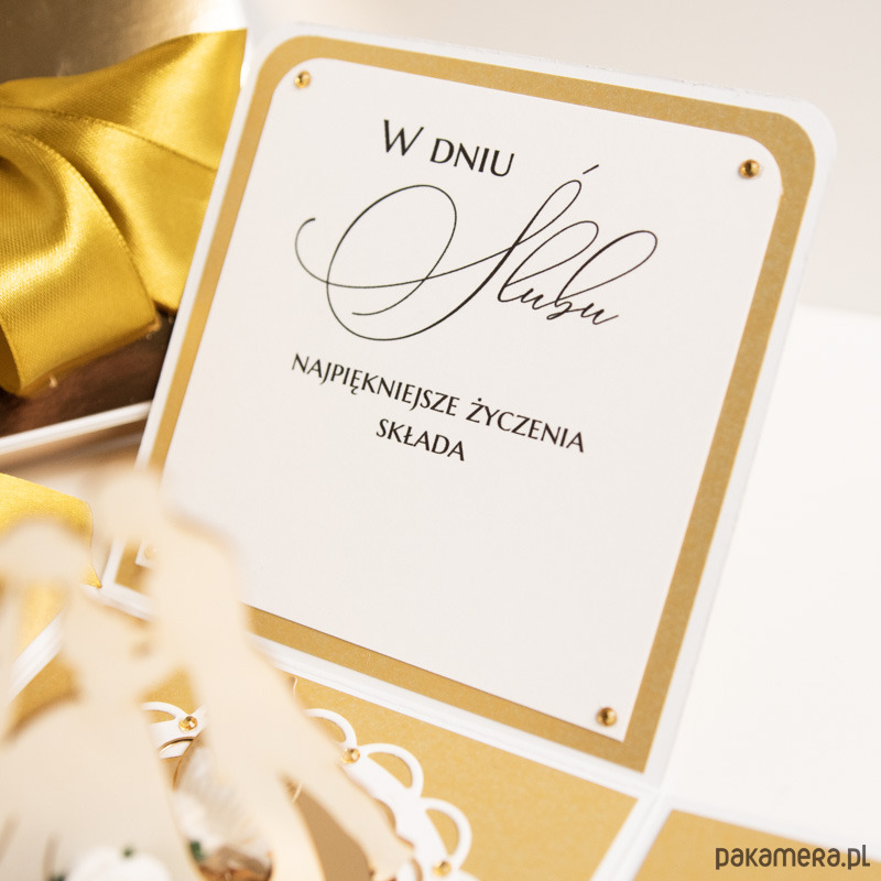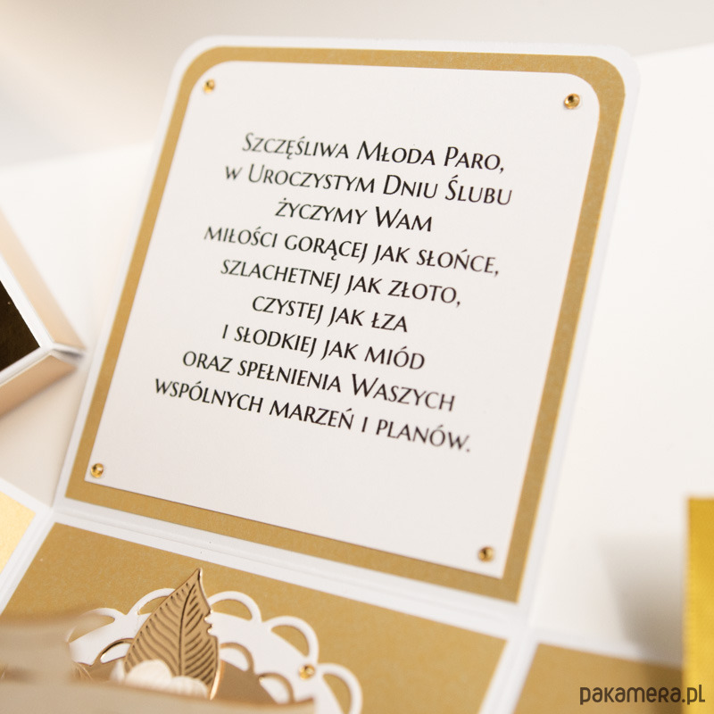 Ręcznie robiona złoya kartka z okazji ślubu w formie rozkładanego "eksplodującego" pudełeczka.