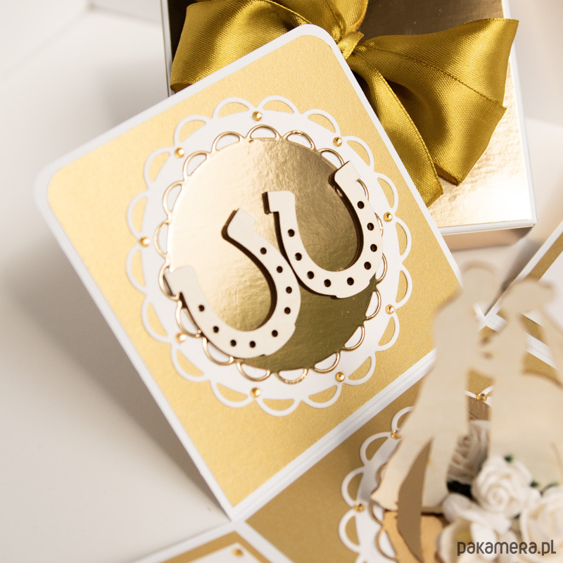 Na środku pudełeczka znajduje się miniaturowa para młoda z papierowymi kwiatuszkami, na ściankach podkowy na szczęście, życzenia dla Nowożeńców, miejsce na podpis oraz miejsce na pieniądze lub kupony lotto (zwija się je w rulonik i przywiązuje tasiemką).