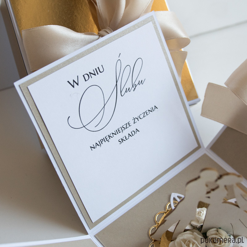 Ręcznie robiona kartka z okazji ślubu w formie rozkładanego pudełeczka.