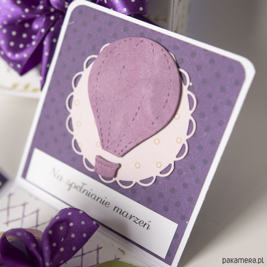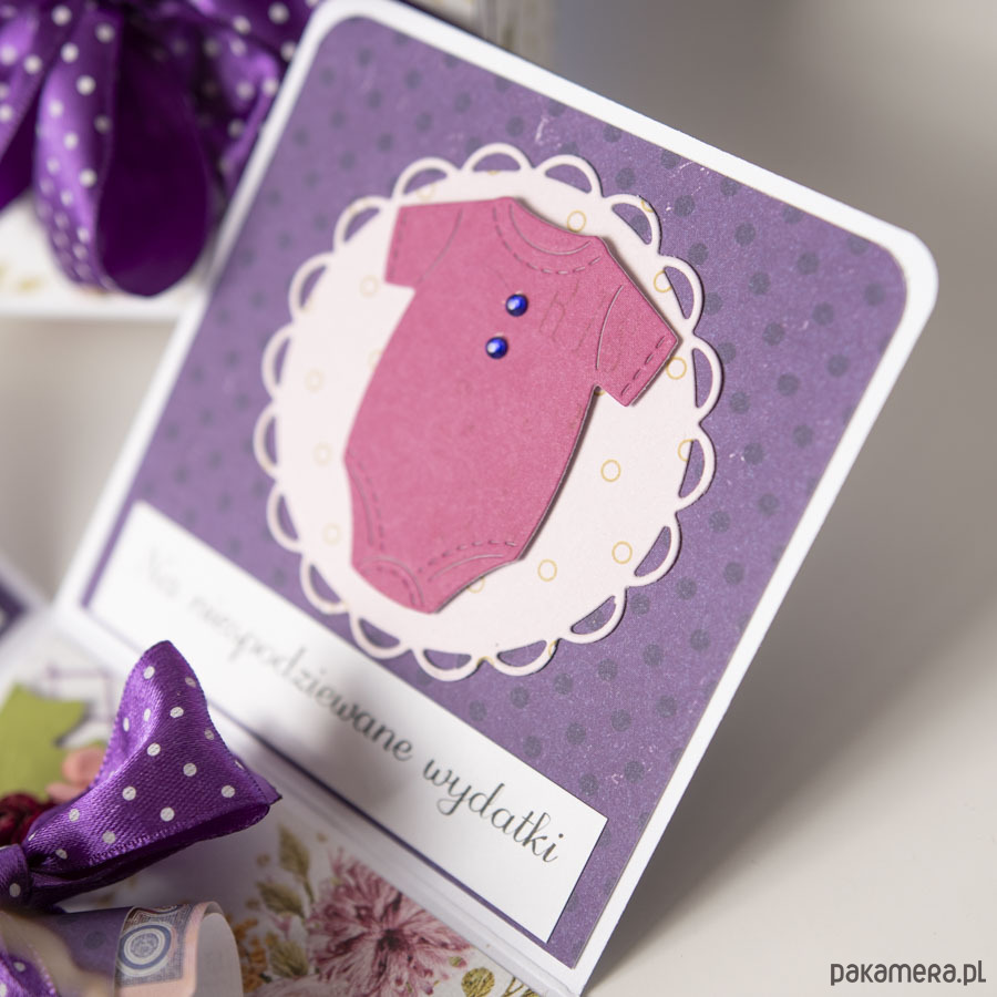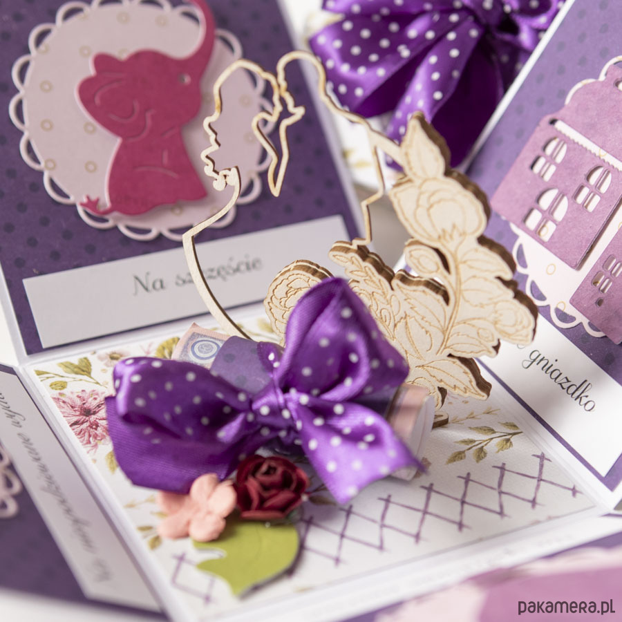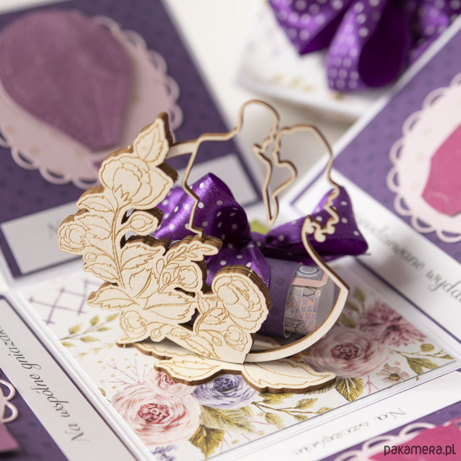 Na środku pudełeczka znajduje się miejsce na pieniądze lub kupony lotto (zwija się je w rulonik i wkłada w miejsce przewiązane kokardą), na ściankach życzenia dla Nowożeńców przedstawione wżartobliwej formie obrazków.