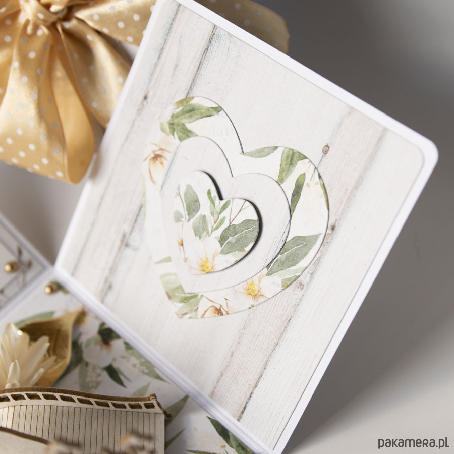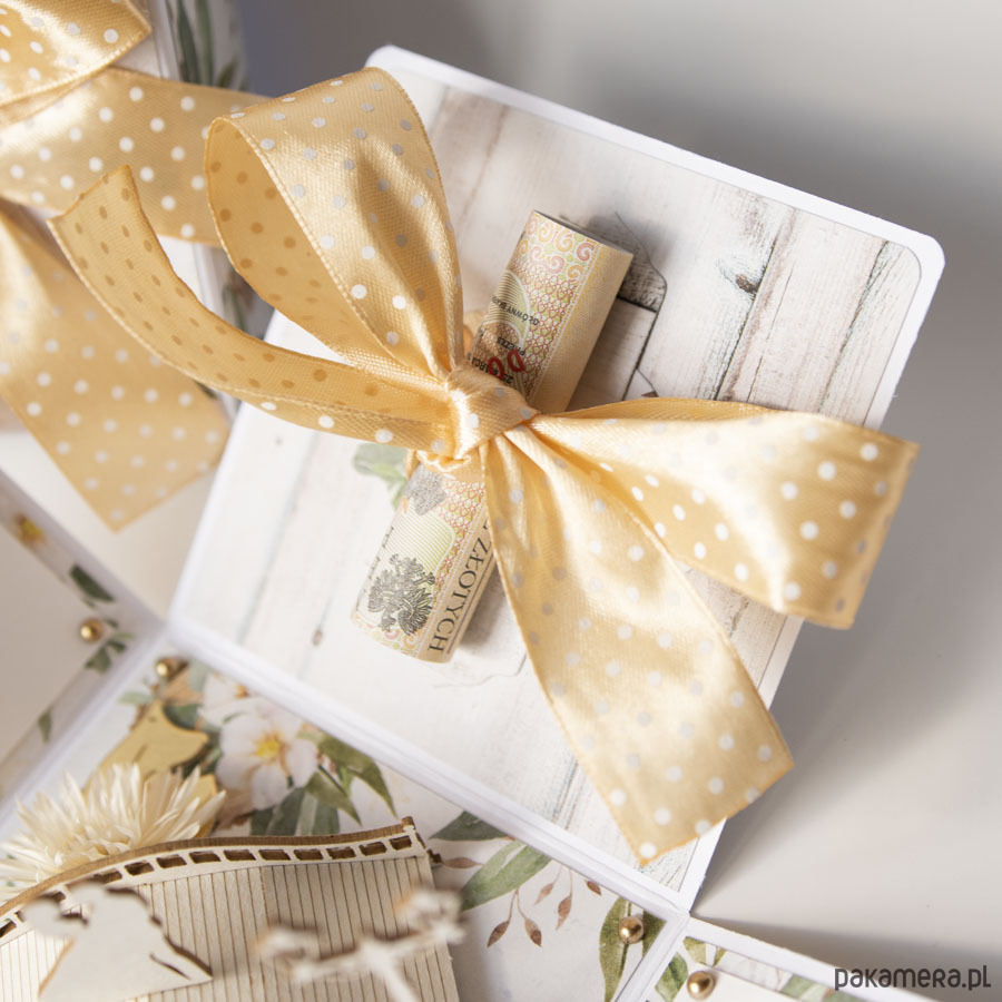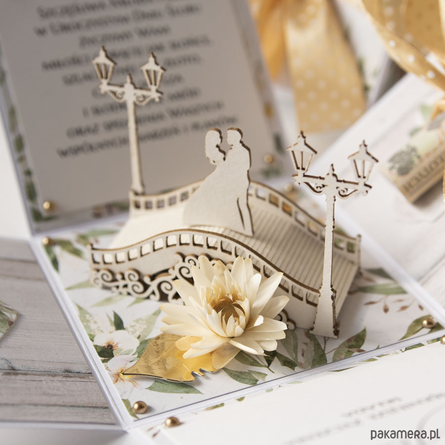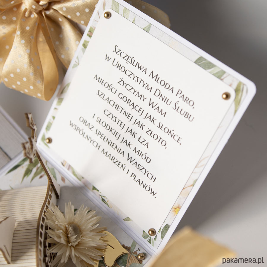 Na środku pudełeczka znajduje się dekoracja - para młoda na mostku z papierowymi kwiatuszkami, na ściankach ozdobne serduszko, życzenia dla Nowożeńców, miejsce na podpis oraz miejsce na pieniądze/kupony lotto itp. (przewiązuje się je satynową kokardą).