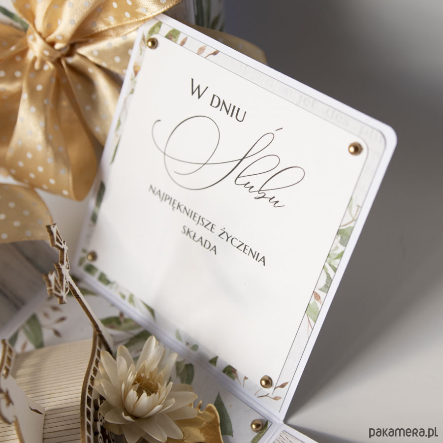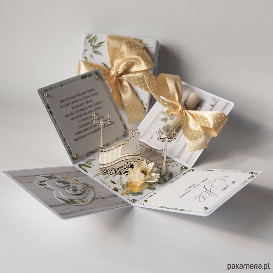 Ręcznie robiona kartka pamiątka z okazji ślubu w formie rozkładanego pudełeczka.