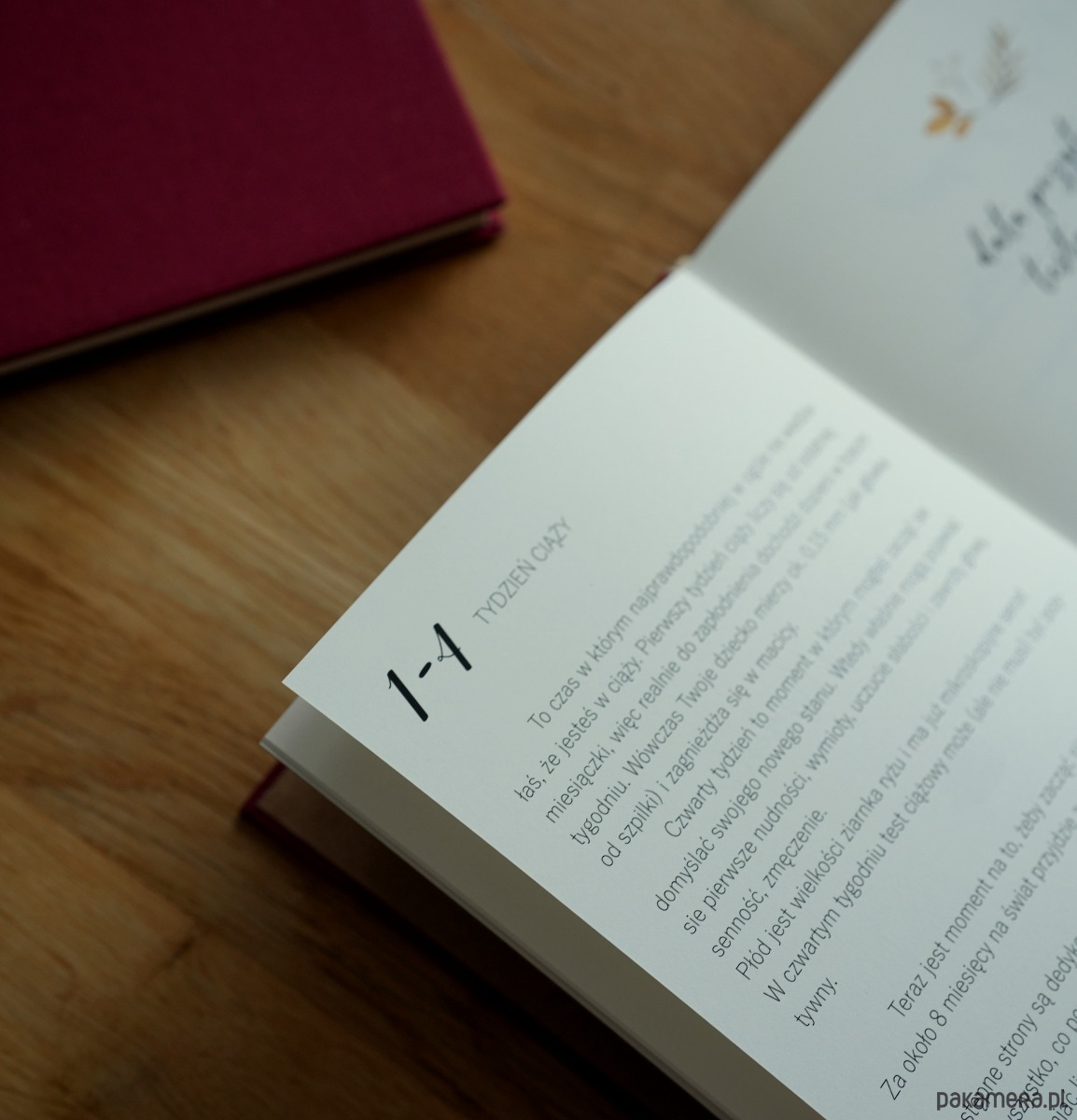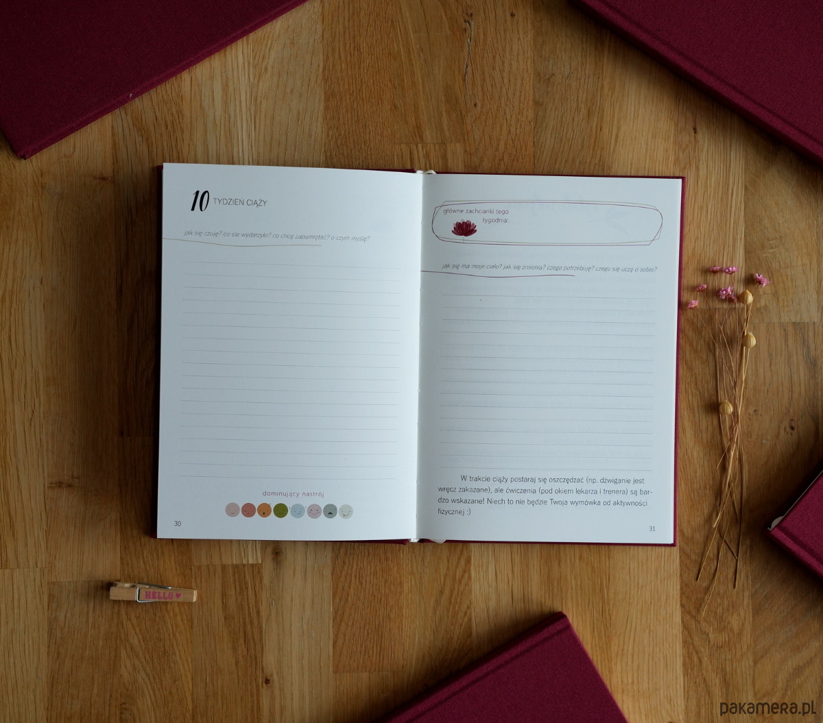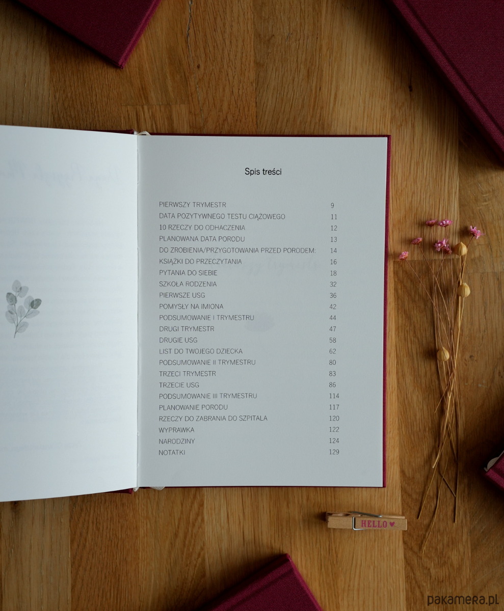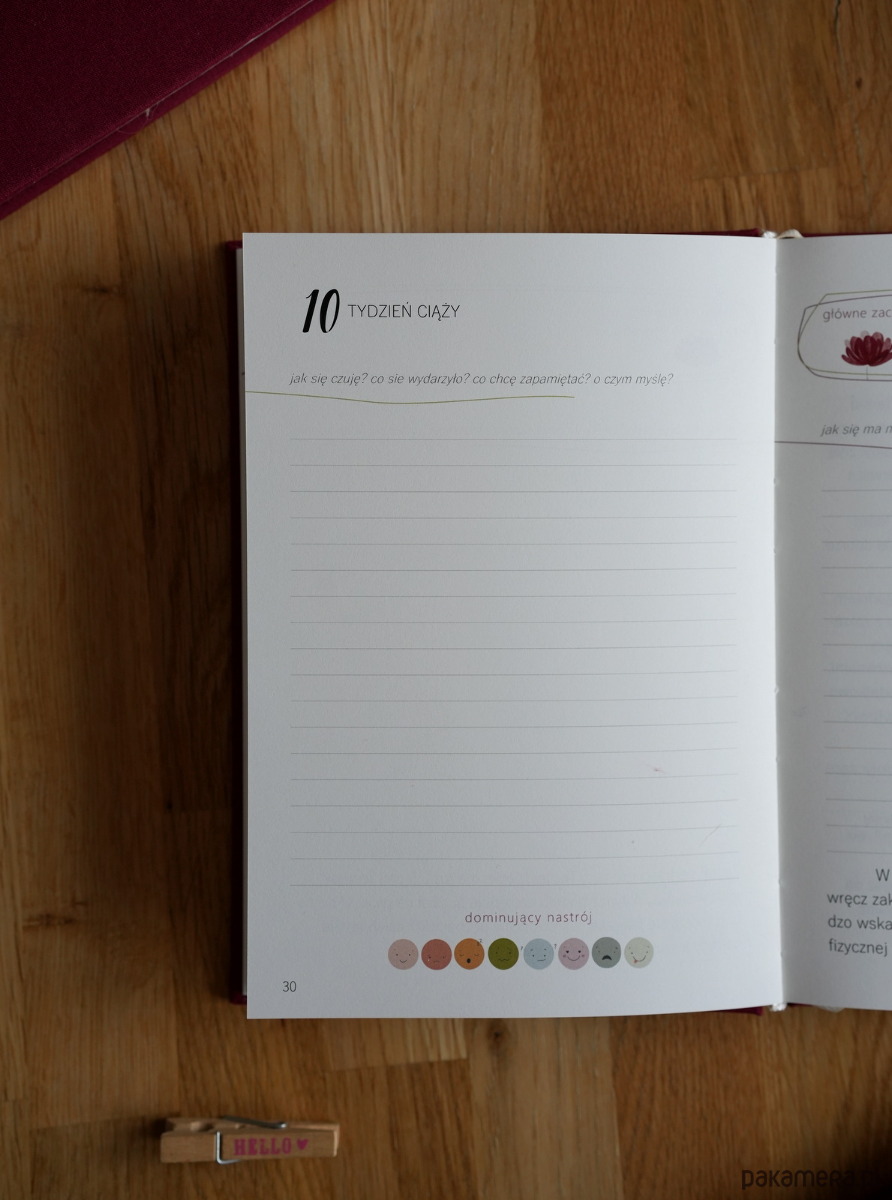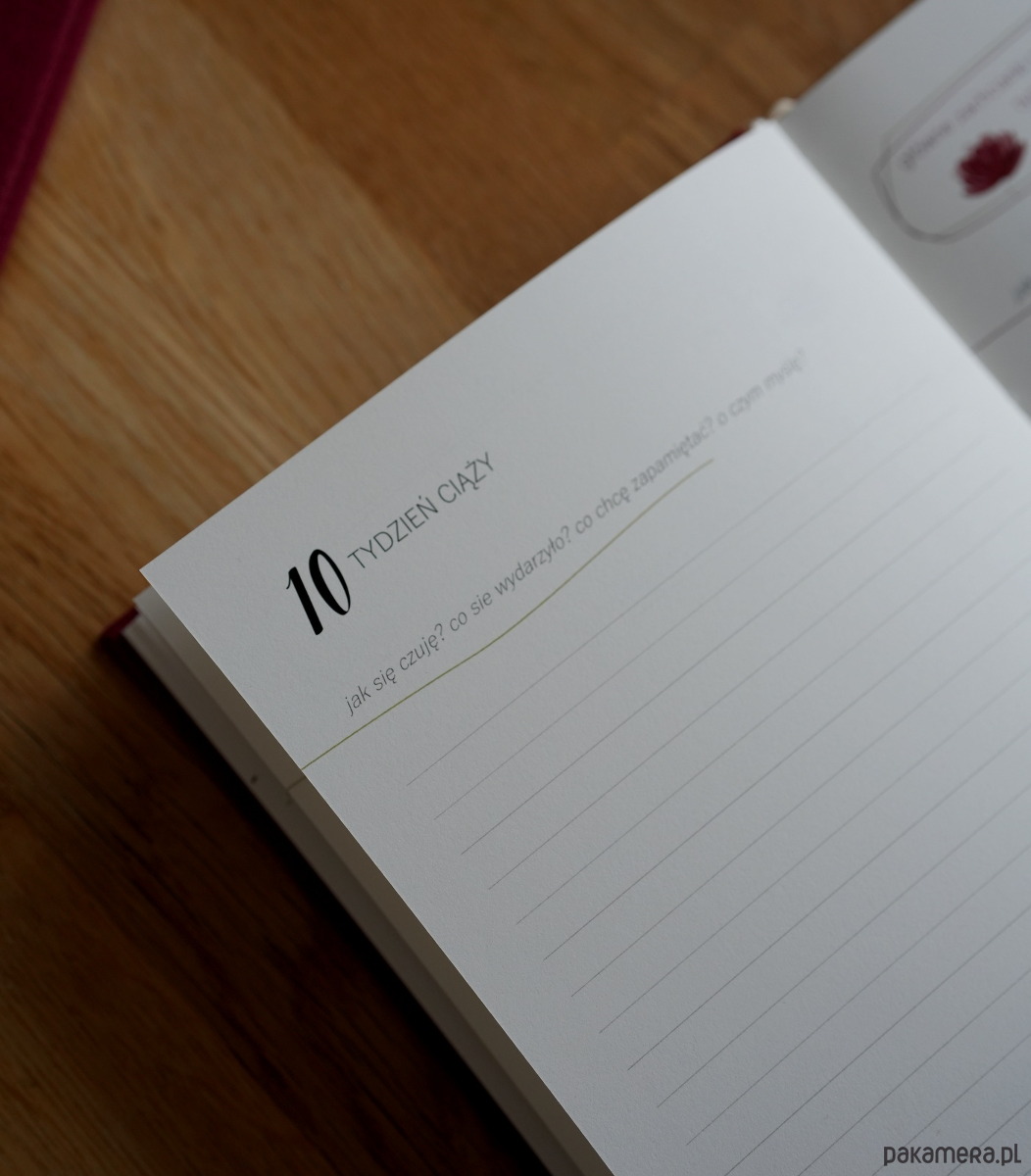 Każdy tydzień pamiętnika ma swój stały rozkład. Poza miejscem na notatki, znajdziesz trackery zachcianek, obwodu talii, objawów które mogą Ci towarzyszyć. Również informacje o tym, jak się rozwija i zmienia Twoje dziecko i czego możesz się spodziewać w danym tygodniu ciąży. Pod koniec każdego trymestru jest strona z podsumowaniem i miejscem na Twoje zdjęcie. W dzienniku znajdziesz wiele dodatkowych stron, na przykład: list do twojego dziecka, miejsce na zdjęcia USG, itp., a także strony dotyczące planu porodu, pełna lista rzeczy, które powinnaś zabrać ze sobą do szpitala, lista wyprawki.