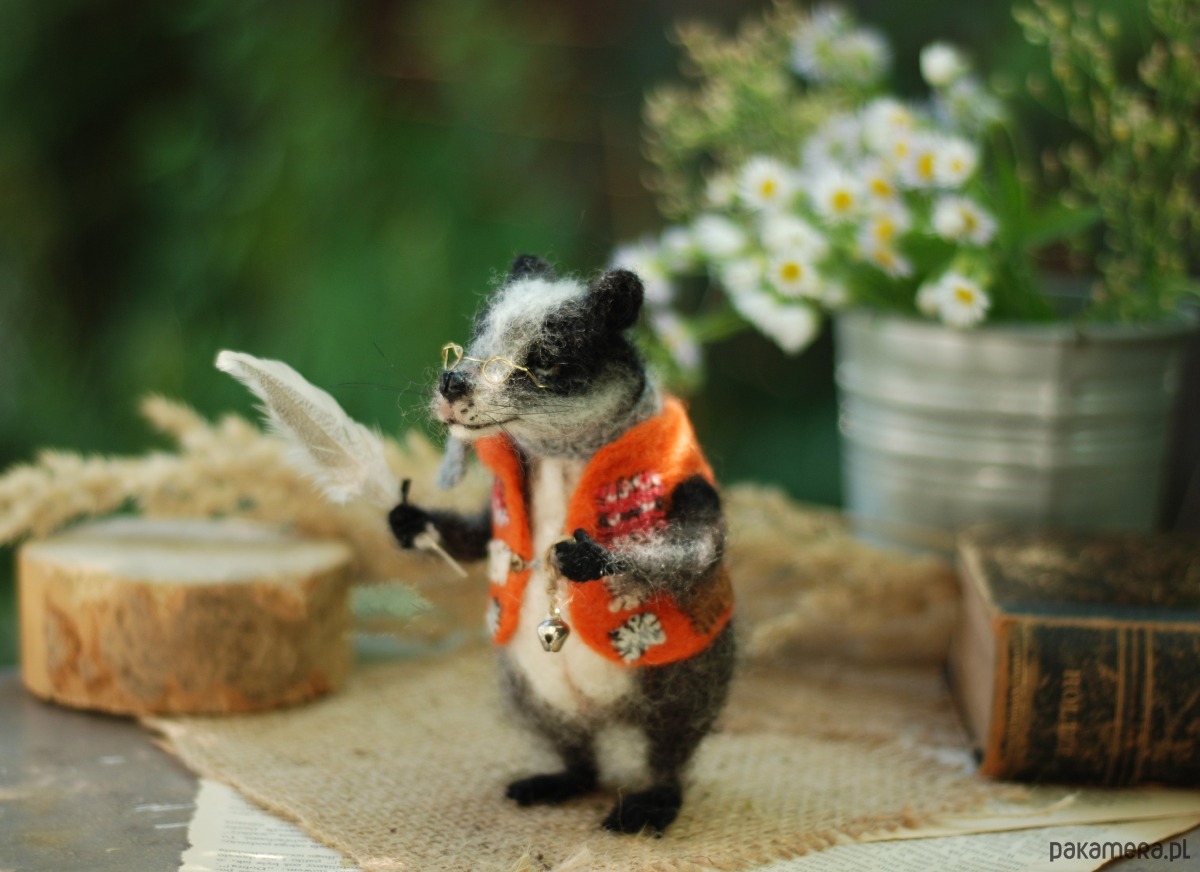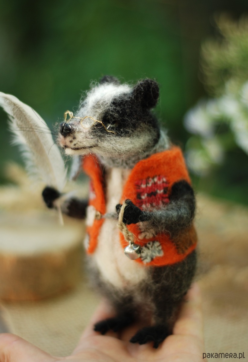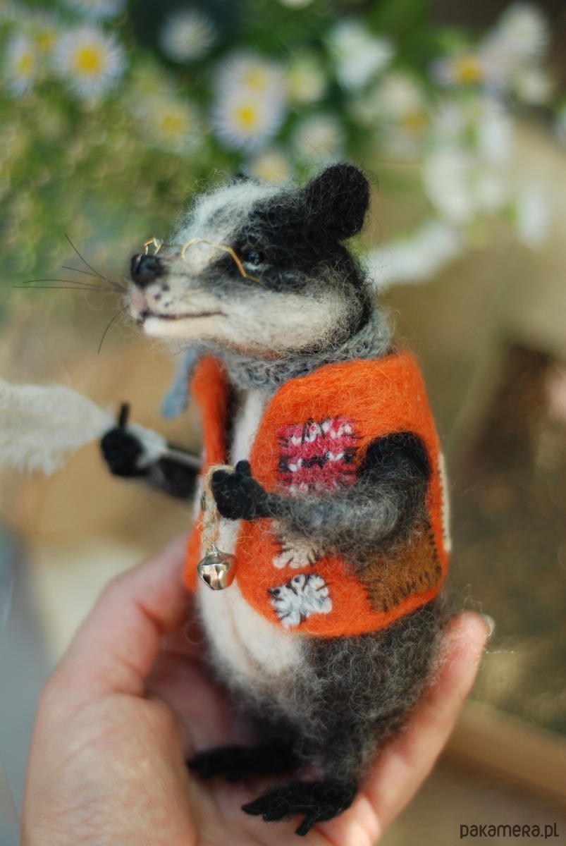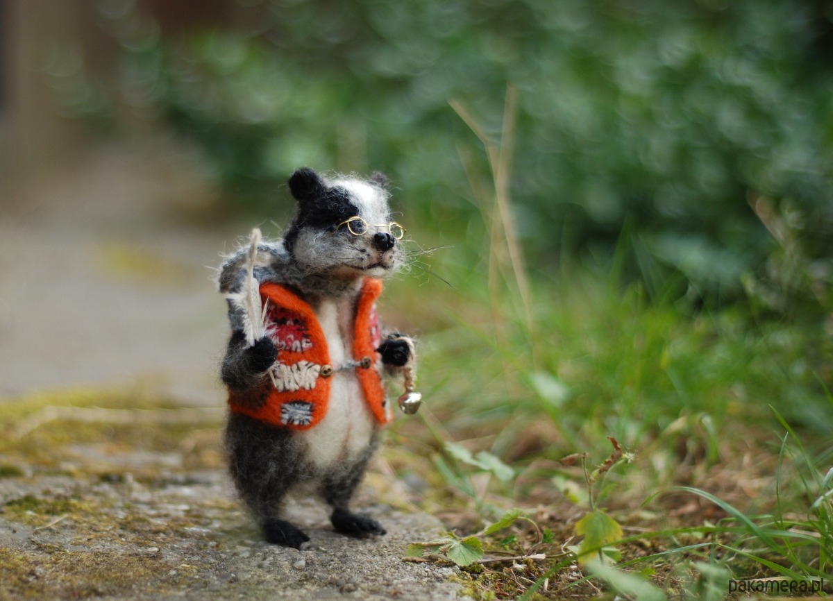 Borsuk wykonany metodą filcowania na sucho z wełny merynos.