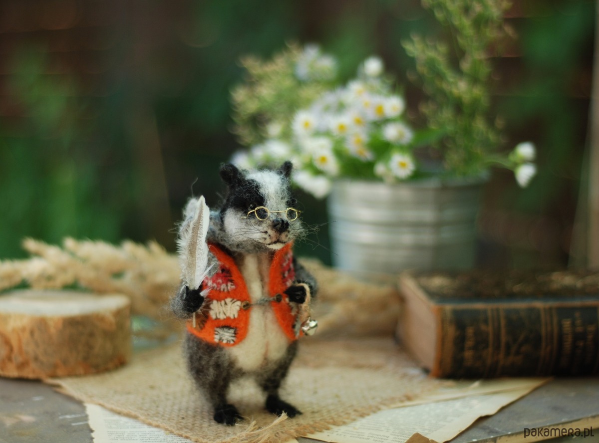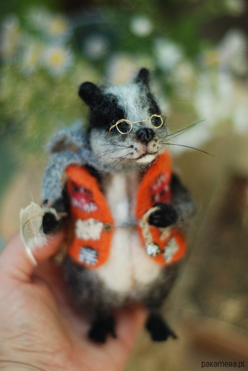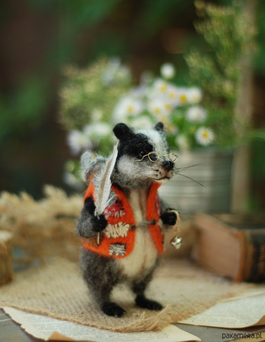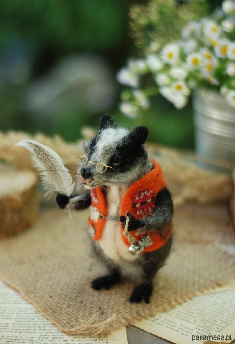 Borsuk wykonany metodą filcowania na sucho z wełny merynos.
